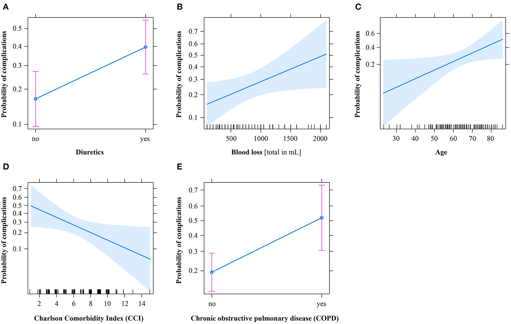 The multiple logistic regression model showed that the variables COPD [0.49 (1.58, 13.5), p = 0.006], age [1.05 (1.01, 1.10); p = 0.034], CCI [0.83 (0.69, 0.98); p = 0.035], intraoperative blood loss [1.0010 (1.00003, 1.0018), p = 0.046], and postoperative fluid overload (“diuretics”) [3.29 (1.39, 8.06), p = 0.008] were associated with PSCs. The model featured a Brier score of 0.16 and an ROC-AUC of 0.76 (0.69, 0.86) with an acceptable goodness of fit (Hosmer and Lemeshow P = 0.14) (Table 3A). The effect plots are presented in Figure 1. We further investigated the protective effect of CCI as suggested by the multiple regression model. The CCI score was highly correlated with age (Pearson's product-moment correlation r = 0.51, p < 0.0001). Both age and CCI appeared in the final regression model, and the impact of having some patients in this cohort with high CCI scores but no complications (and vice versa) was amplified by having both age and CCI as predictors in the final model. That is, the effect of the CCI on outcome was adjusted for age and the other predictors. Note that the outcome variable and CCI were not associated in the univariable analysis (p = 0.705).