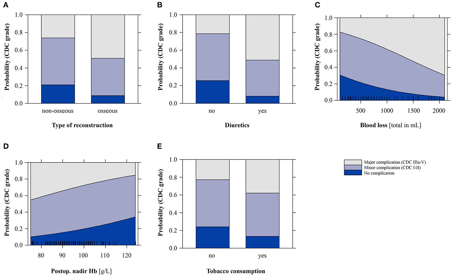 The following variables remained in the final optimized ordinal regression model (Table 3B): tobacco consumption [0.72 (0.02, 1.44) p = 0.043], osseous flap [1.01 (0.21, 1.84), p = 0.014], postoperative fluid overload (“diuretics”) [1.36 (0.63, 2.11), p < 0.001], and intraoperative blood loss [0.001 (0.0004, 0.0020), p = 0.004]. In addition, the postoperative nadir Hb value (g/L) was included, but it was not significant [−0.03 (−0.07, 0.01), p = 0.108]. The final model features a Somer's delta measure of ordinal association of 0.52, and the effect plot to predict CDC is presented in Figure 3.