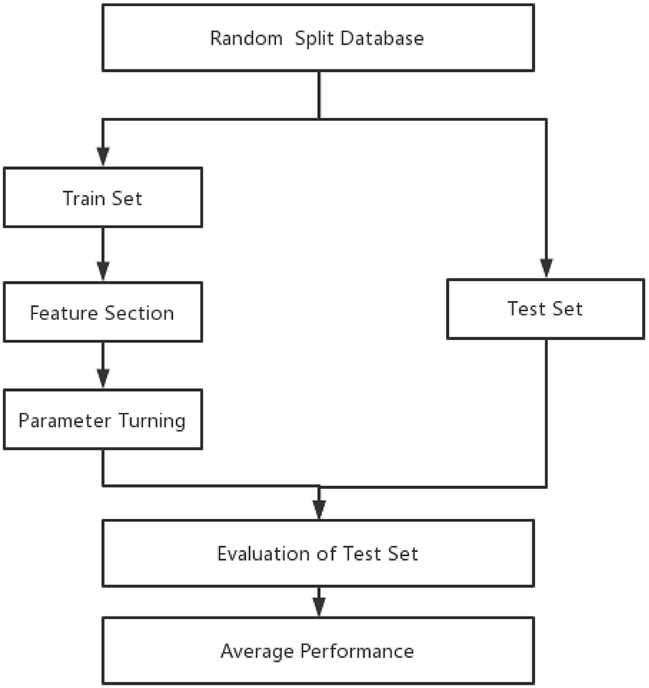 The whole data samples were randomly split into training and test sets according to a division of 7:3. Optimal features and hyperparameters combinations for the model were determined on the training set. Furthermore, 5-fold cross-validation (23) was used in the process of feature selection and hyperparameters (Figure 1).
