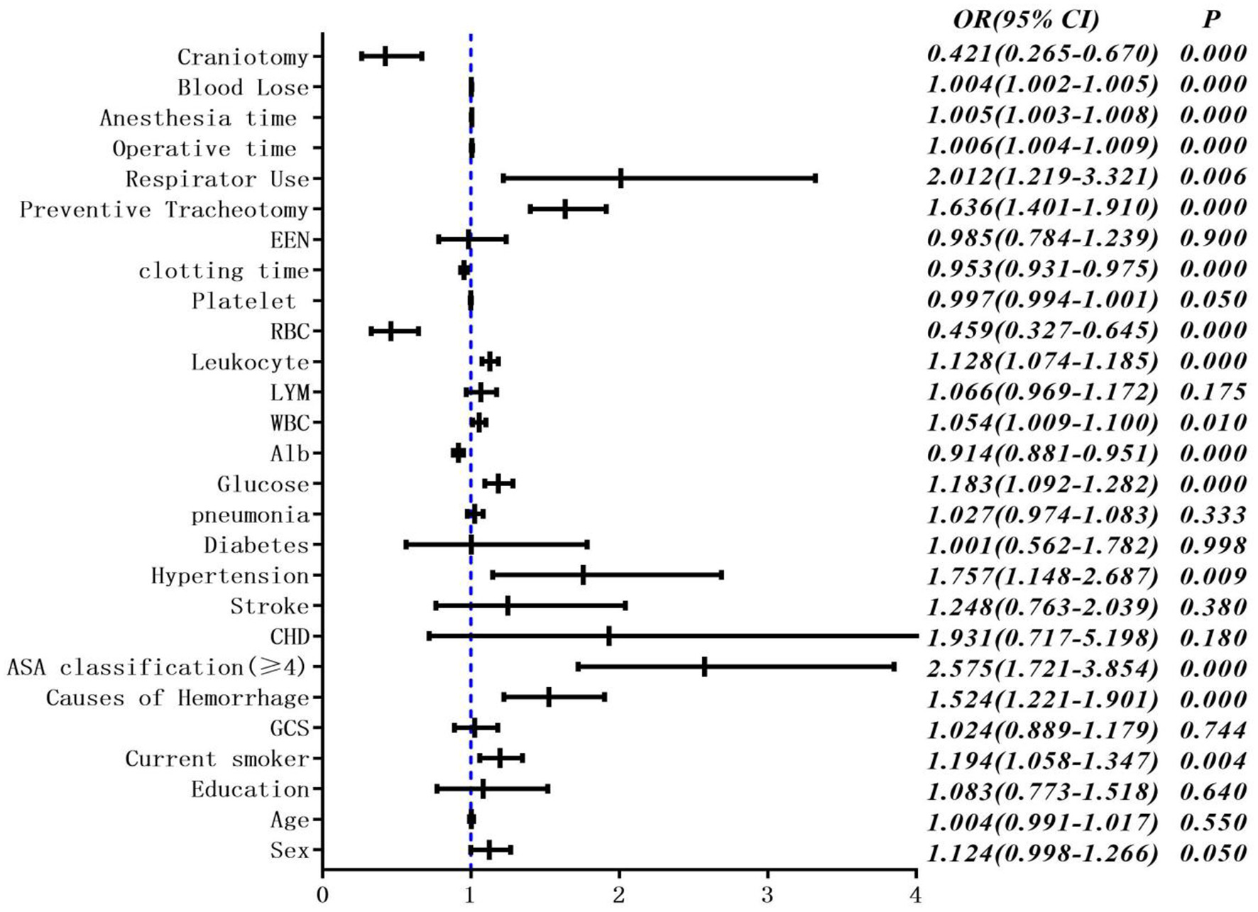 The study was approved by our local institutional review board. The clinical data of patients who underwent emergency ICH surgery at a single institution during a 4-year period between January 1, 2017 and December 31, 2020 were reviewed and analyzed in a retrospective fashion. The characteristics of the patients included in this study were sex, age, education, medical history (coronary heart disease history, stroke history, hypertension history, and diabetes history), respiratory history, whether a current smoker, Glasgow coma scale (GCS), glucose, Albumin (Alb), WBC, lymphocyte count, leukocyte, RBC, platelet, clotting time, early enteral nutrition, preventive tracheotomy respirator use, operative time, anesthesia time, the blood loss, ASA classification, and craniotomy.