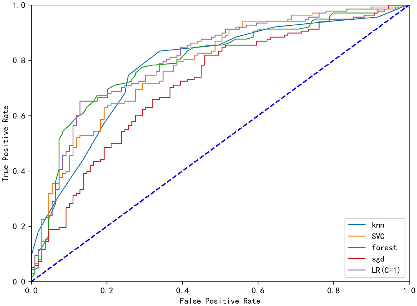 The ROC curve analysis of the four derived models (KNN), Stochastic Gradient Descent (SGD), Support Vector Classification (SVC), Random Forest (RF), Stochastic Gradient Descent (SGD) and logistics regression (LR).