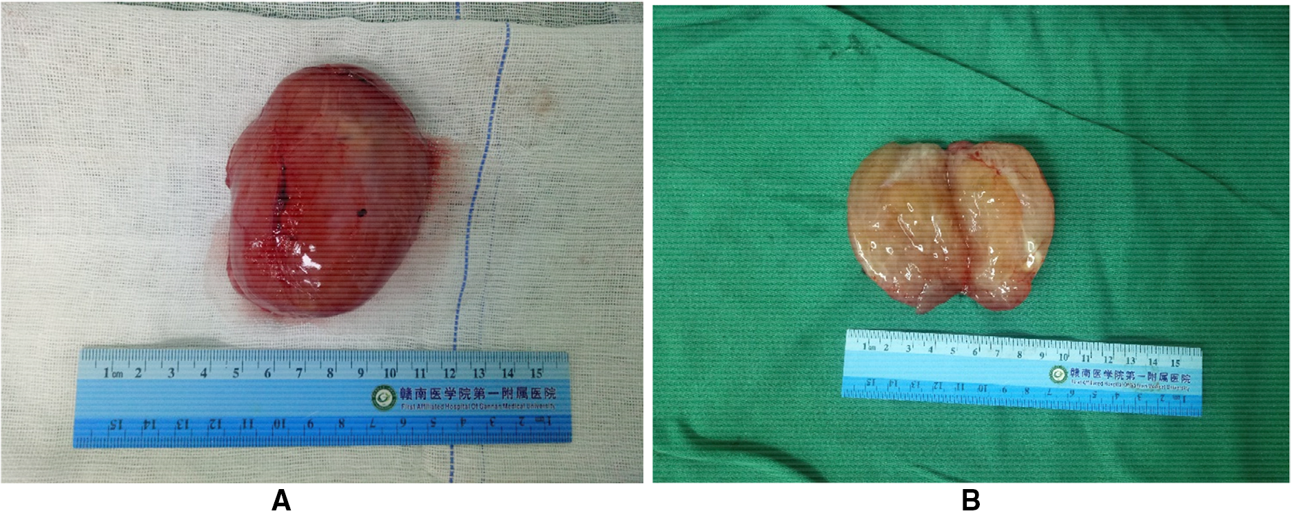 Patient tumor specimen. (A) The excised specimen was approximately 8.5 cm × 6 cm × 5 cm with clear margins. (B) The surface is grayish white, jelly-like, rubber-like.