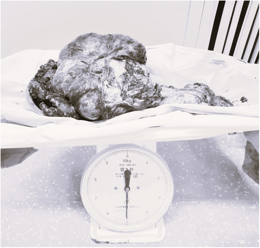 CRS was continued for about 3.5 h and about 5 kg of diseased or metastasized tissues were removed (Figure 3). During the surgery, the patient experienced 3000 ml of blood loss and excreted 600 ml of urine, was administered 3800 ml of lactated Ringer's solution and 2500 ml of colloidal solution and 200 ml 20% albumin. During the CRS, intermittent arterial blood gas analysis was performed. When the hemoglobin was decreased from 9.6 g/dl to 6.0 g/dl, then 7 units of suspended red blood cells and 1,000 ml of fresh frozen plasma were given. 100 ml of sodium bicarbonate were given when BE was decreased to −7.8 according to the blood gas analysis. Before HIPEC, the oropharyngeal temperature was deceased from 36.4°C to 35.2°C in spite of the usage of heating blanket. The detail of blood gas analysis at different time points during the surgery was shown in Table 1.