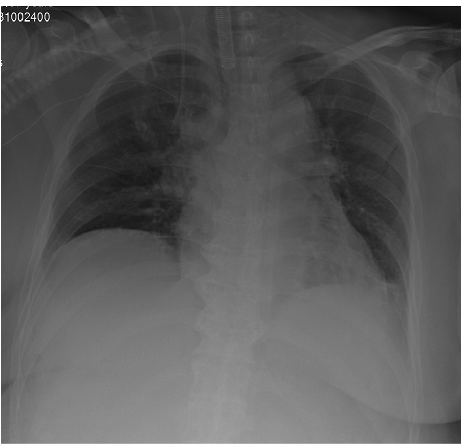 In the whole period of surgery, the hemodynamic was maintained by noradrenaline when needed. IBP and HR were controlled at 90–110/40–50 mmHg and 60–75 beats/minute. CI and SVV were maintained at 1.9–2.6 L/min.m2and 5–16. Lac was decreased from 0.9 mmol/L at the beginning to 0.6 mmol/L at the end of the surgery. Hb was decreased from 9.6 g/dl at the beginning to 8.5 g/dl at the end of the surgery.The patient was transferred to intensive care unit (ICU) after the operation. x-Ray of Chest revealed the elevated diaphragm was descended at a normal position (Figure 4). Patient underwent five separate sessions of intraperitoneal thermoperfusion chemotherapy from the 3rd to the 8th day after surgery; She had her abdominal drain removed on the 11th postoperative day, and was discharged on the 15th postoperative day. No other complications were observed.