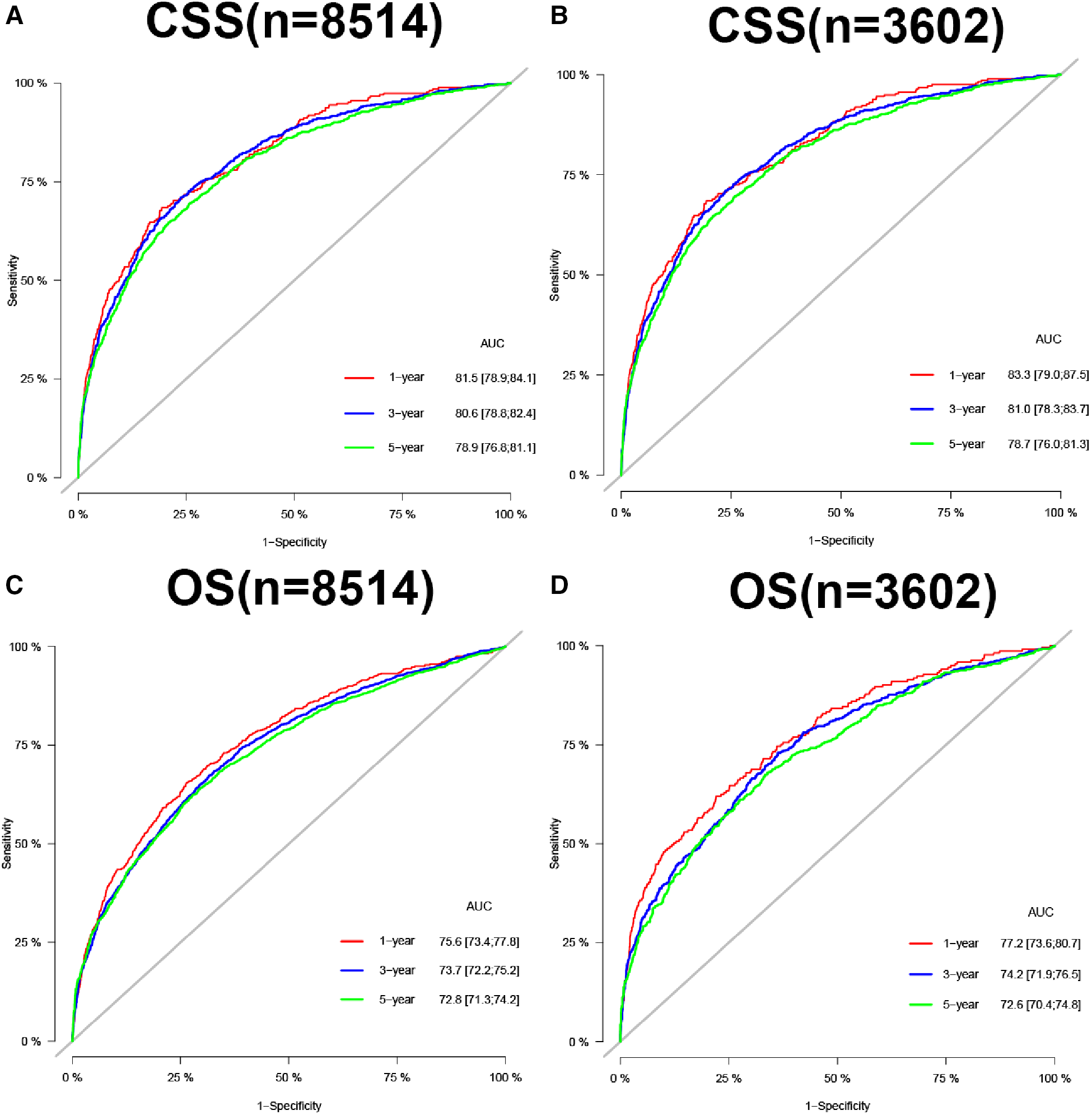 All patients were randomly divided into a training cohort (70%) and a validation cohort (30%). In the training cohort, univariate and multivariate Cox regression model analyses were used to screen independent risk factors for CSS and OS of patients. The hazard ratio (HR) and 95% confidence interval (CI) were recorded. A new nomogram was developed to predict patients' 1-, 3-, and 5-year CSS and OS based on independent risk factors. The calibration curve of 1,000 bootstrap samples was used for internal validation to evaluate the model's accuracy. We used the consistency index (C-index) to assess the discriminative power of the predictive model. We also used the area under the receiver operating curve(AUC) of the model to evaluate the discriminatory ability of the model.