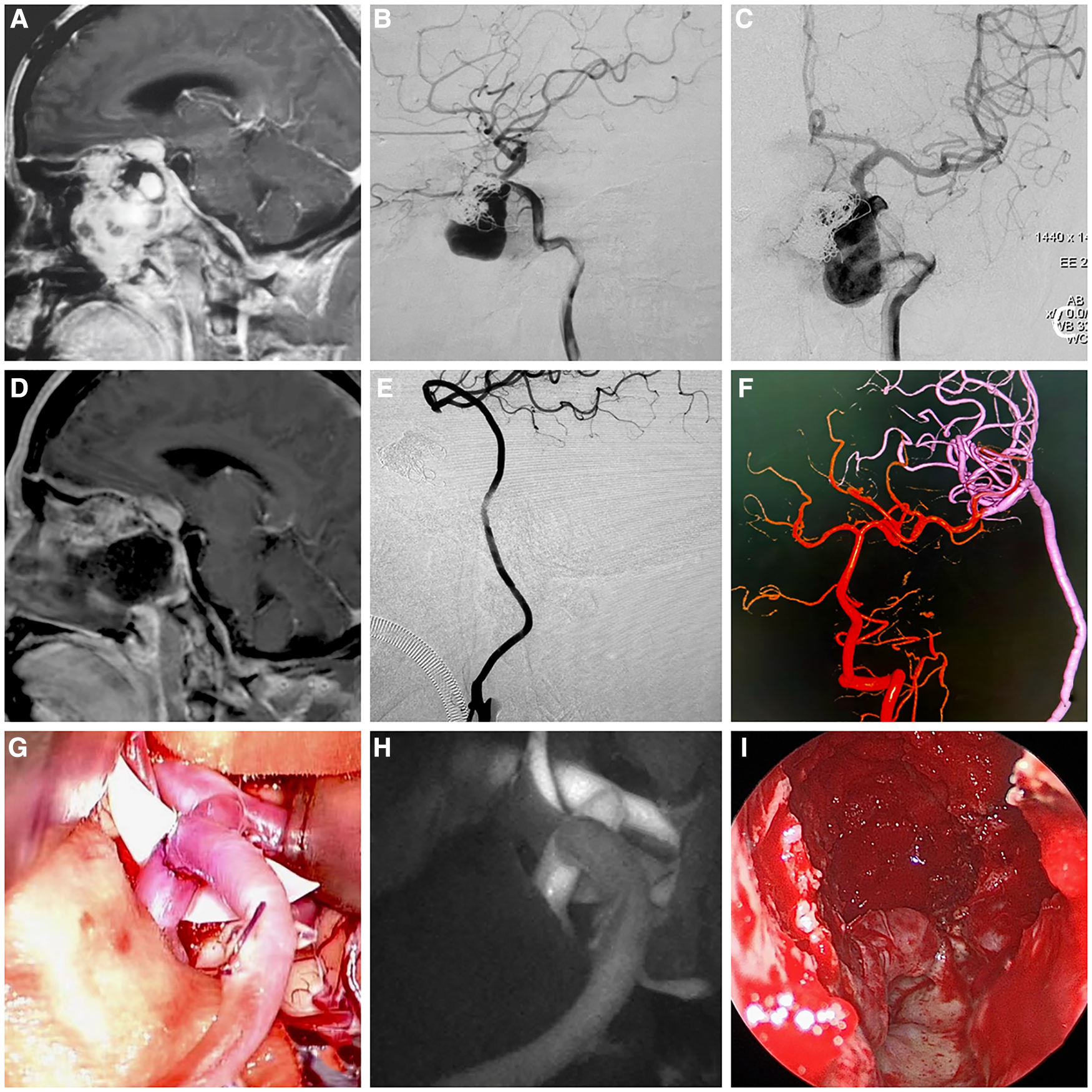 Images of a patient with recurrent fibrous dysplasia combined with internal carotid artery aneurysm who received Fukushima bypass type III (ECA-RA-M2) combined with transnasal endoscopic surgery to remove the affected bone, achieved optic nerve decompression and resection of the left internal carotid artery aneurysm. (A) Preoperative enhanced cranial magnetic resonance imaging (MRI) showing the internal carotid artery was invaded, and an aneurysm was formed. (B, C) Preoperative lateral and front digital subtraction angiography (DSA) projections showing the internal carotid artery and aneurysm. (D) Postoperative enhanced cranial MRI showing subtotal resection of the tumor and adequate decompression. (E, F) Postoperative cerebral DSA showing good patency of the radial artery graft, no visualization of ICA-C1 to ICA-C4 segments, and anterior cerebral circulation blood supply from posterior cerebral circulation. (G) Intraoperative image of Fukushima bypass type III (ECA-RA-M2). (H) Intraoperative fluorescein angiography showing good patency of the radial artery graft. (I) Intraoperative images of endoscopic subtotal resection of tumors.
