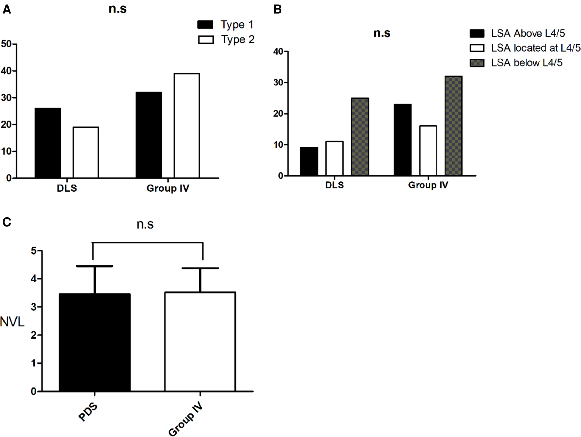 Change in spinal alignment in subjects without primary degenerative scoliosis who displayed roussouly type 1. (A). There was no statistical difference among the four groups for the LAS distribution. (B). There was no statistical difference among the groups for the NVL distribution.