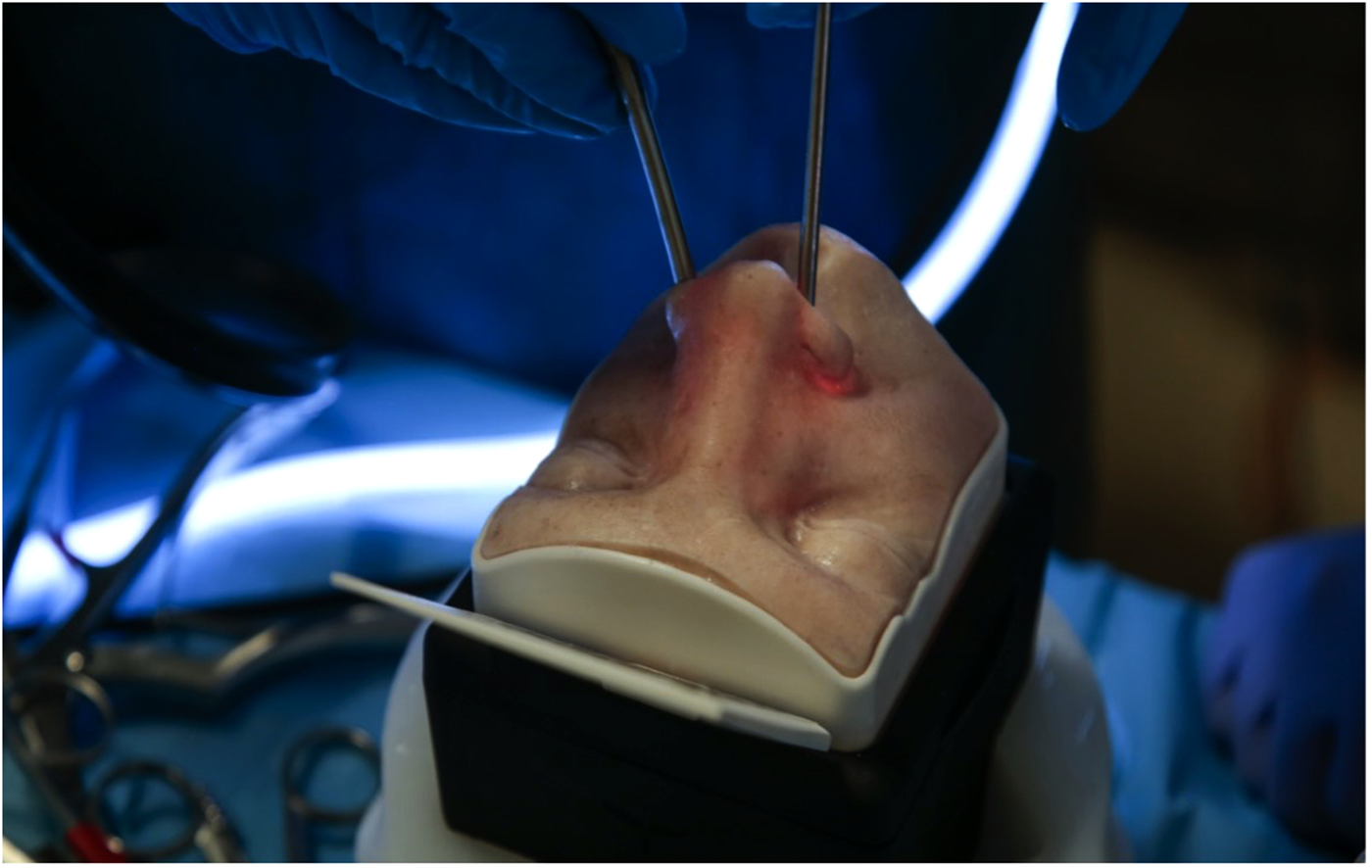 The Transsphenoidal Box (TNS) is a high-fidelity simulator for the transsphenoidal endonasal approach to the pituitary fossa (Figures 1, 2). The TNS box comprises of a nasal cavity with a 3D face overlay and is manufactured using silicones and resins through 3D printing. The model enables users to explore the nasal cavity, identify anatomical landmarks and resect pituitary tumours endoscopically through careful dissection and drilling techniques.