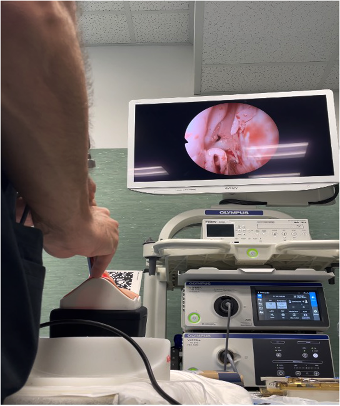 Participants were asked to perform a sphenoidotomy using the TNS Box. The task was performed endoscopically using the Olympus S200 visera elite endoscope and participants were supplied with an instrument set. The task focused on the core steps and specific technical skills required during the nasal phase of the eTSA derived from an expert Delphi consensus (
