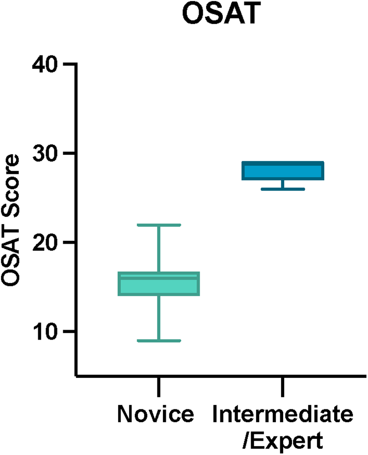 Total OSAT score for novice and intermediate and expert participants. The horizontal solid line in the middle of the box is the median value of the scores and the lower and upper boundaries indicate the 25th and 75th percentiles, respectively. The largest and smallest observed values are shown; lines (whiskers) are drawn from the ends of the box to those values.