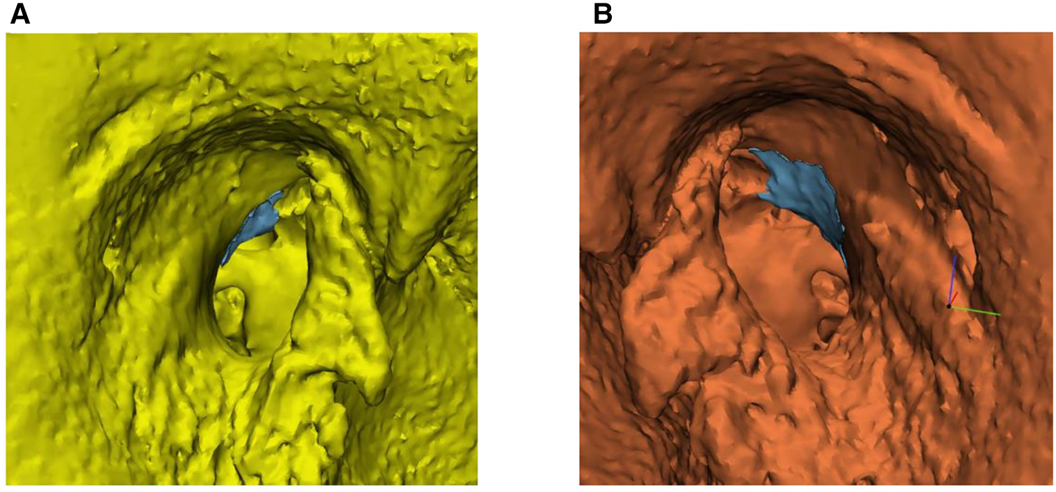 We measured the minimum and maximum diameter of the OEAC, because it is interesting to know from a surgical perspective whether the shape and diameter of the bony ear canal is of predictive value for successful stapes surgery. For the measurements of the diameter of the OEAC, we used the centroid of the OEAC's elliptical shape rather than the Feret diameter (see Figure 2) (16, 17). Using the Feret diameter would be incorrect in our study, as it leads to the largest minimum diameter rather than the smallest minimum diameter of the elliptical shape of each 0.3 slice of the OEAC. The significant moderate correlation between the smallest minimum and maximum diameter of the OEAC were in line with the literature (16). It might be an interesting additional surgical aid to be acquainted with the bony diameter along the ear canal (from lateral to medial) and to visualize its spatial orientation (and 3D direction). The visibility of the stapes might be limited when the angle of the OEAC is 30° or more in relation to the horizontal plane (16). See as an example two different ear canal characteristics in Figure 6. We could use these measurements of the diameter of the OEAC to make a preoperative surgical guide that predicts the feasibility of the endoscopic approach for each patient (16), which could be helpful in patients with congenital ear deformities. Future prospective in vivo studies will be necessary to further elaborate on this strategy and support its usefulness.