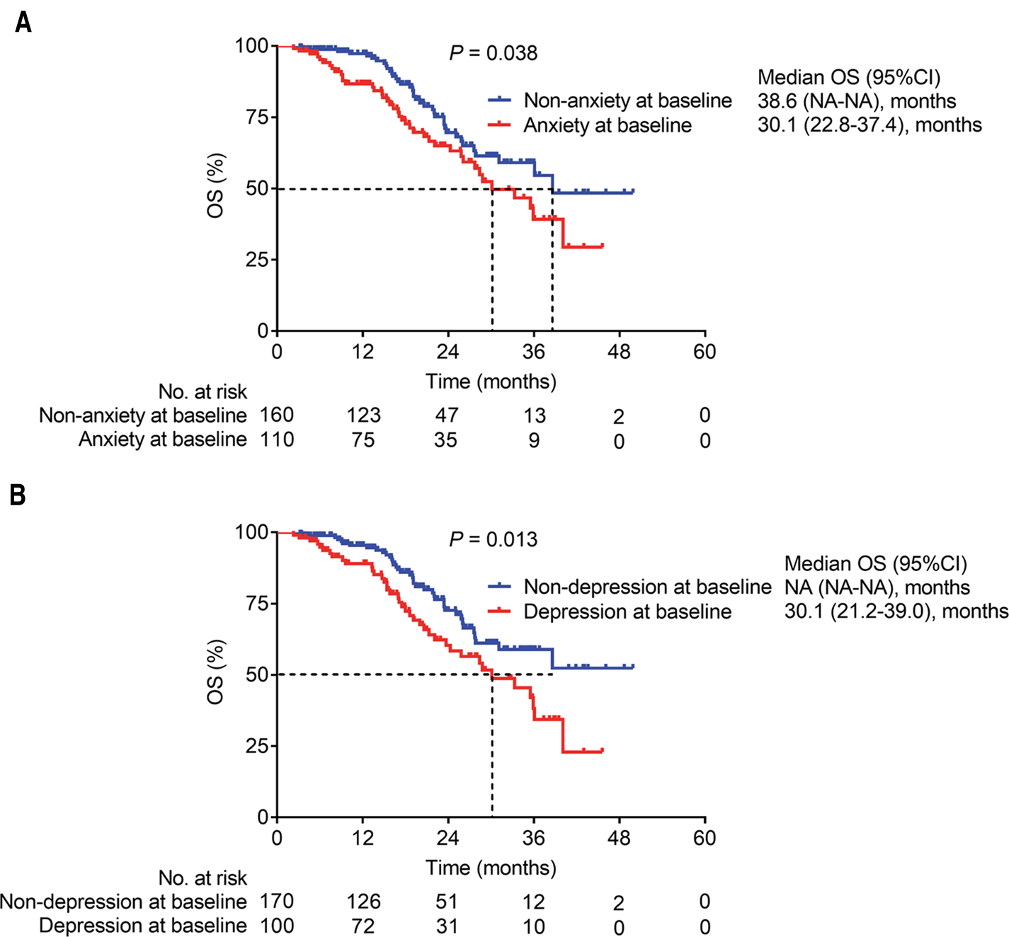 The statistical analyses were conducted by SPSS v27.1 (IBM Corp., United States). The figures were plotted via GraphPad Prism v8.01 (GraphPad Software Inc., United States). Risk factors of anxiety or depression were assessed via univariable and multivariate logistic regression model with step forward methods, and all factors shown in the univariable logistic regression model were included in the multivariate logistic regression model. The difference in survival data between groups was displayed using Kaplan-Meier curves and analyzed log-rank test. Factors related to OS were evaluated through univariable and multivariate Cox's regression model with step forward methods, and all factors shown in the univariable Cox's regression model were included in the multivariate Cox's regression model. The change of HADS score was tested by analysis of variance (ANOVA) for repeated measurements. The change in anxiety or depression rate was tested by the Chi-square test for trend. P < 0.05 was considered significant.