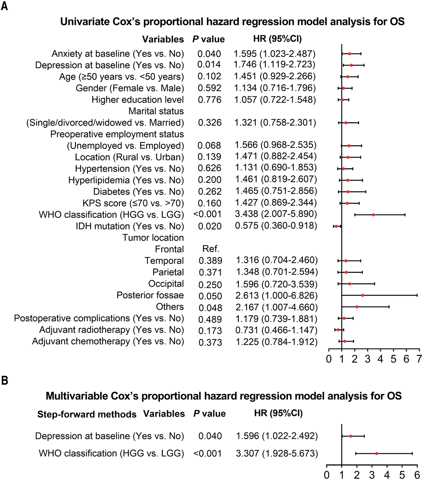 Gender (female vs. male) (P = 0.014, odds ratio (OR) = 1.974), marital status (single/divorced/widowed vs. married) (P = 0.019, OR = 2.172), Karnofsky performance status (KPS) score (≤70 vs. > 70) (P = 0.002, OR = 2.556), World Health Organization (WHO) classification (high-grade glioma (HGG) vs. low-grade glioma (LGG)) (P = 0.005, OR = 2.155), and postoperative complications (yes vs. not) (P = 0.001, OR = 2.525) were independently related to anxiety occurrence. Marital status (single/divorced/widowed vs. married) (P = 0.034, OR = 2.026), KPS score (≤70 vs. > 70) (P < 0.001, OR = 3.880), WHO classification (HGG vs. LGG) (P = 0.032, OR = 1.810), and postoperative complications (yes vs. not) (P = 0.001, OR = 2.602) were independently related to depression occurrence. Besides, anxiety (P = 0.038) and depression (P = 0.013) were linked with shorter overall survival (OS), and depression was an independent risk factor for worse OS (P = 0.040, hazard ratio = 1.596). More importantly, anxiety and depression remained at a high prevalence during a 3-year follow-up.
