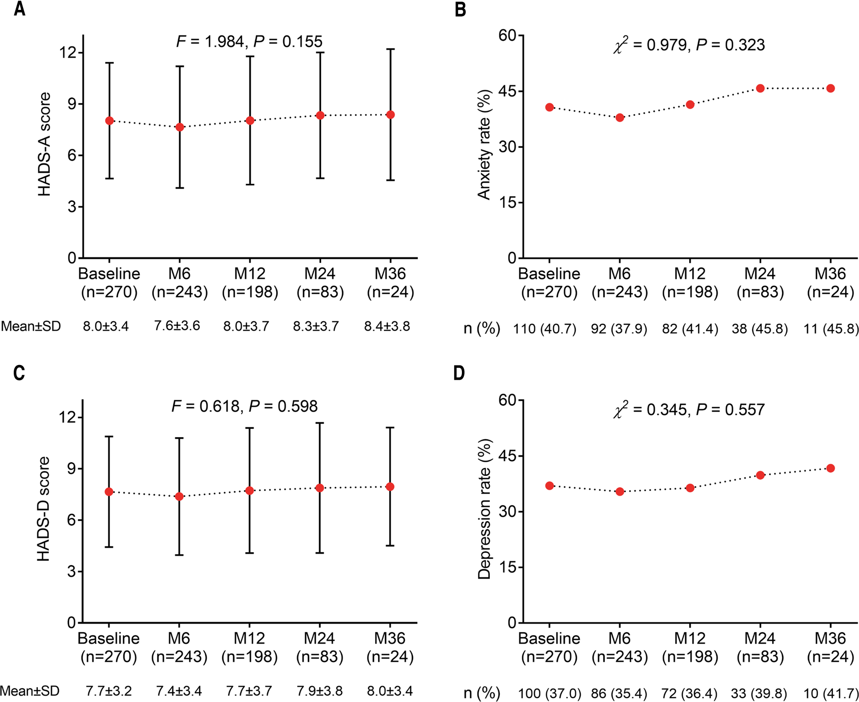 Anxiety and depression were assessed by Hospital Anxiety and Depression Scale at baseline, month (M) 6, M12, M24 and M36 in 270 glioma patients after surgical resection. Furthermore, comprehensive clinic characteristics and treatment-related information were collected.