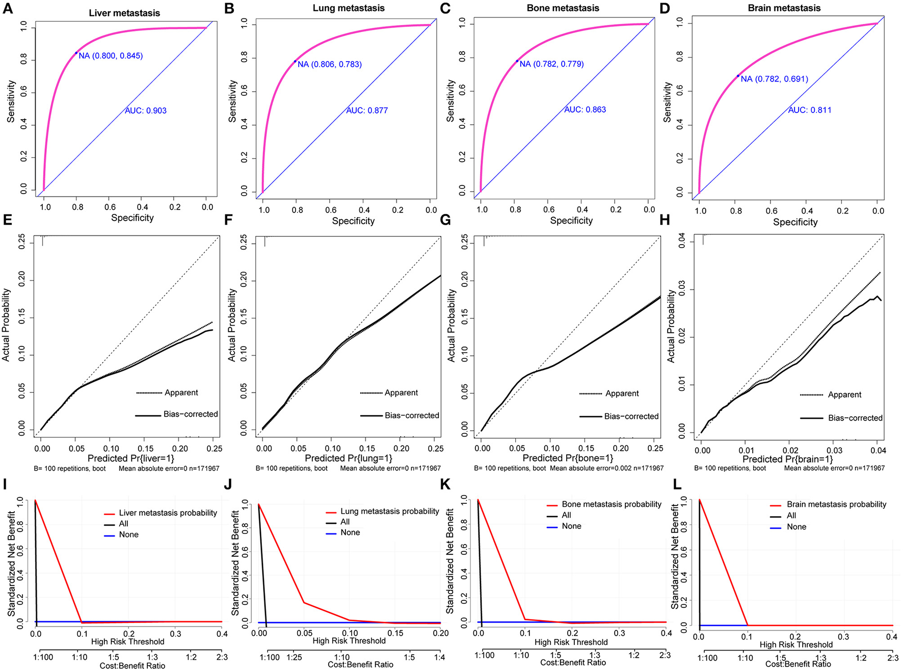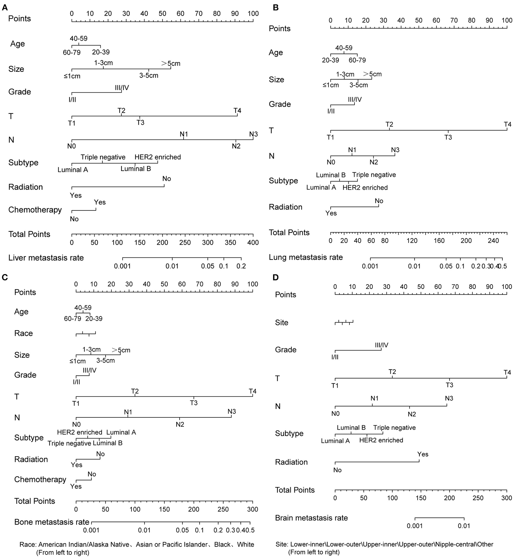 | Liver metastasis | Lung metastasis | Bone metastasis | Brain metastasis | |||||