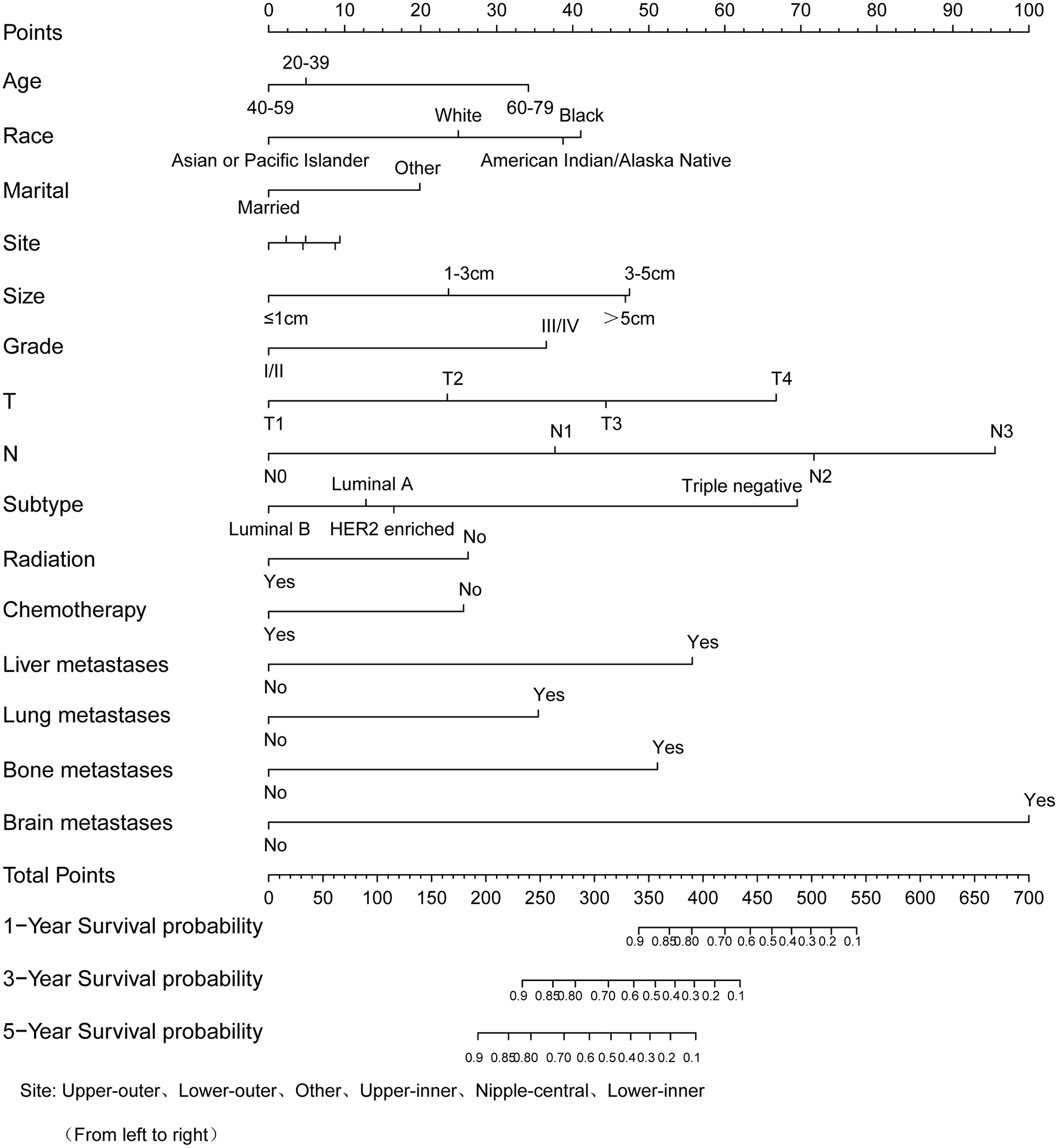 Patient demographic variables, including age at diagnosis, marital status, and race, were extracted from the database. Tumor factors, including tumor site, tumor size, grade, T stage, N stage, molecular type and metastatic sites (bone, brain, liver, and lung). Treatment modalities, such as radiotherapy and chemotherapy, as well as survival status and survival time were obtained from the database.