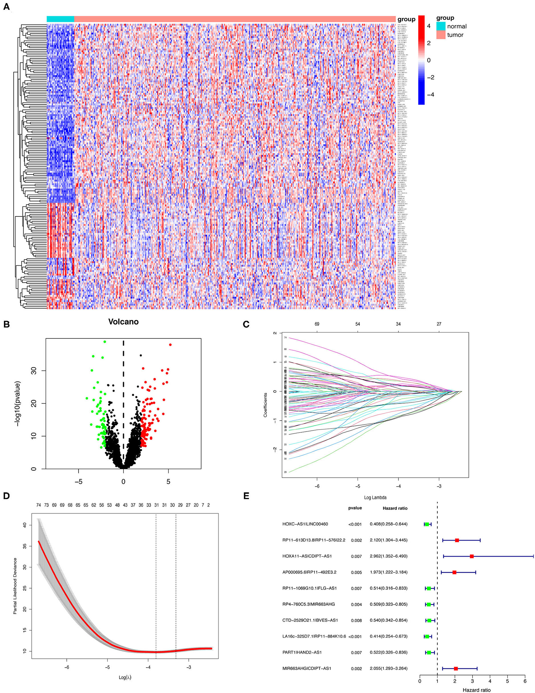 Establishment of a risk assessment model using DEirlncRNA pairs. (A,B) The heatmap (A) and a volcano plot (B) showed 161 DEirlncRNA in normal and GC tissues from the TCGA database. The colors from blue to red in the heat map represent low to high expression levels. Red and green dots represent up- and down-regulated irlncRNA, respectively. Black dots indicate no differential expression of irlncRNA. (C) LASSO Cox regression model profiles of 81 DEirlncRNA pairs selected by univariate Cox regression analysis in the training group. (D) The penalty coefficient was utilized to minimize the mean square error of the model. (E) A forest plot of the 10 DEirlncRNA pairs determined through multivariable Cox regression analysis. Unadjusted HRs are shown with 95% confidence intervals.
