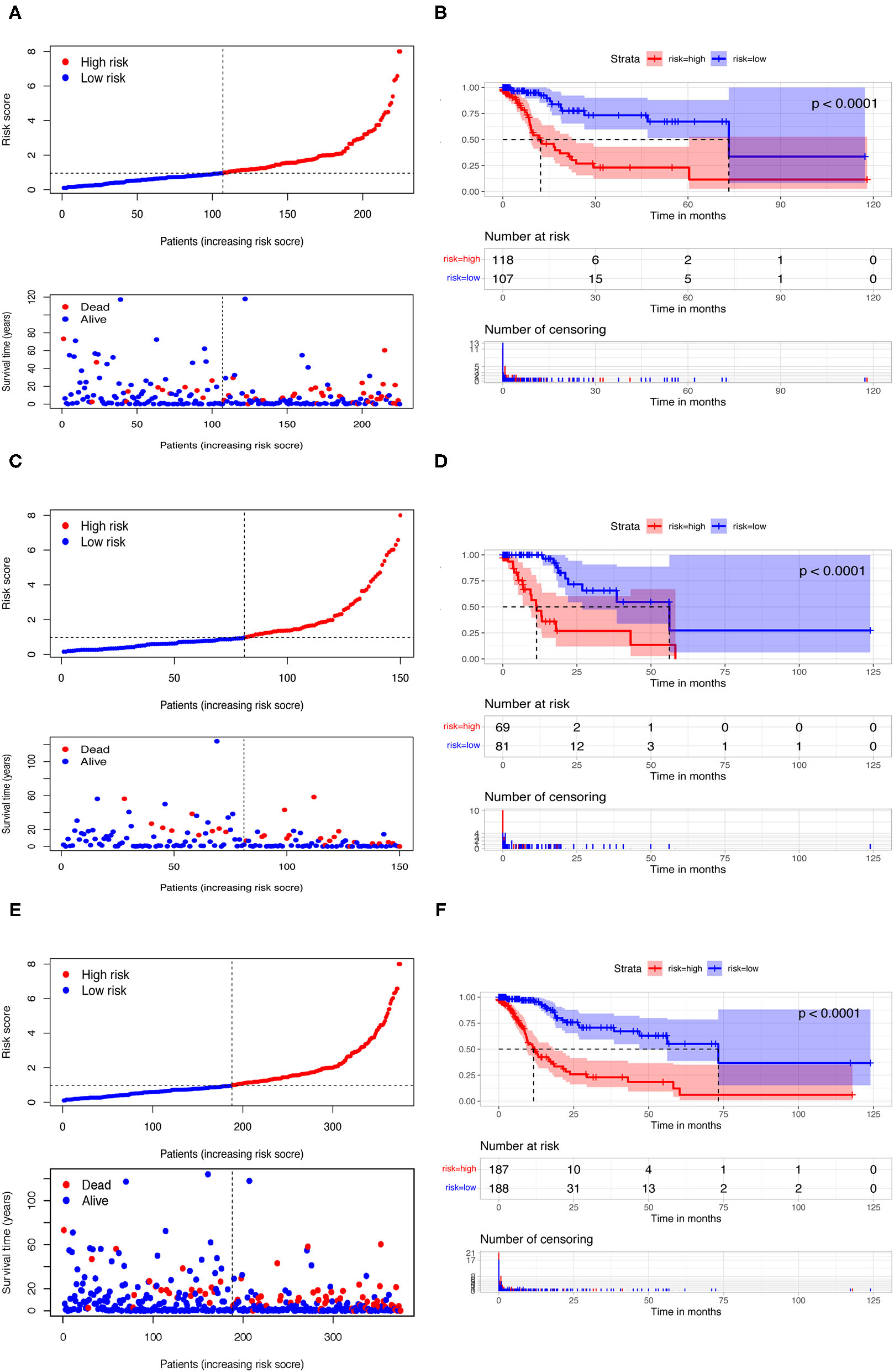 Risk assessment model for prognosis prediction. Patients in training (A), testing (C), and the whole cohort (E) were scored and divided into high-risk group (red) and low-risk group (blue). A scatter plot of patient survival was then plotted according to the size of the risk score, with blue representing living patients and red representing death; the OS in the low- and high-risk groups in three cohorts were presented by Kaplan-Meier curve analysis (B,D,F).