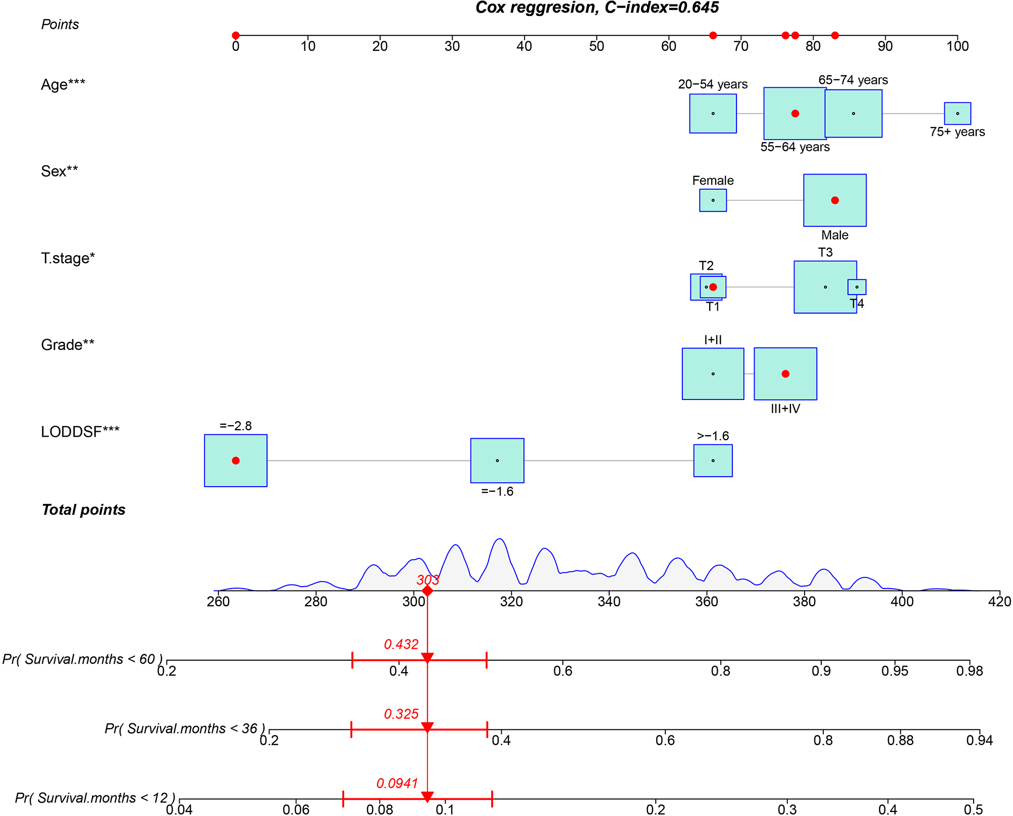 We conducted the univariate and multivariate Cox hazards proportional regression analysis to confirm the independent risk factors for the patients' survival, shown in Table 3. Univariate analysis was conducted for the variables of age, race, sex, tumor site, T stage, N stage, histology, histology grade, tumor size, and LODDS, indicating that age, sex, T stage, N stage, grade, and LODDS were significantly associated with the OS of the patients (P < 0.05), which were integrated into the multivariate Cox hazards proportional regression model except for N stage which had collinearity with the LODDS. The multivariate model included five variables: age, sex, T stage, grade, and LODDS.