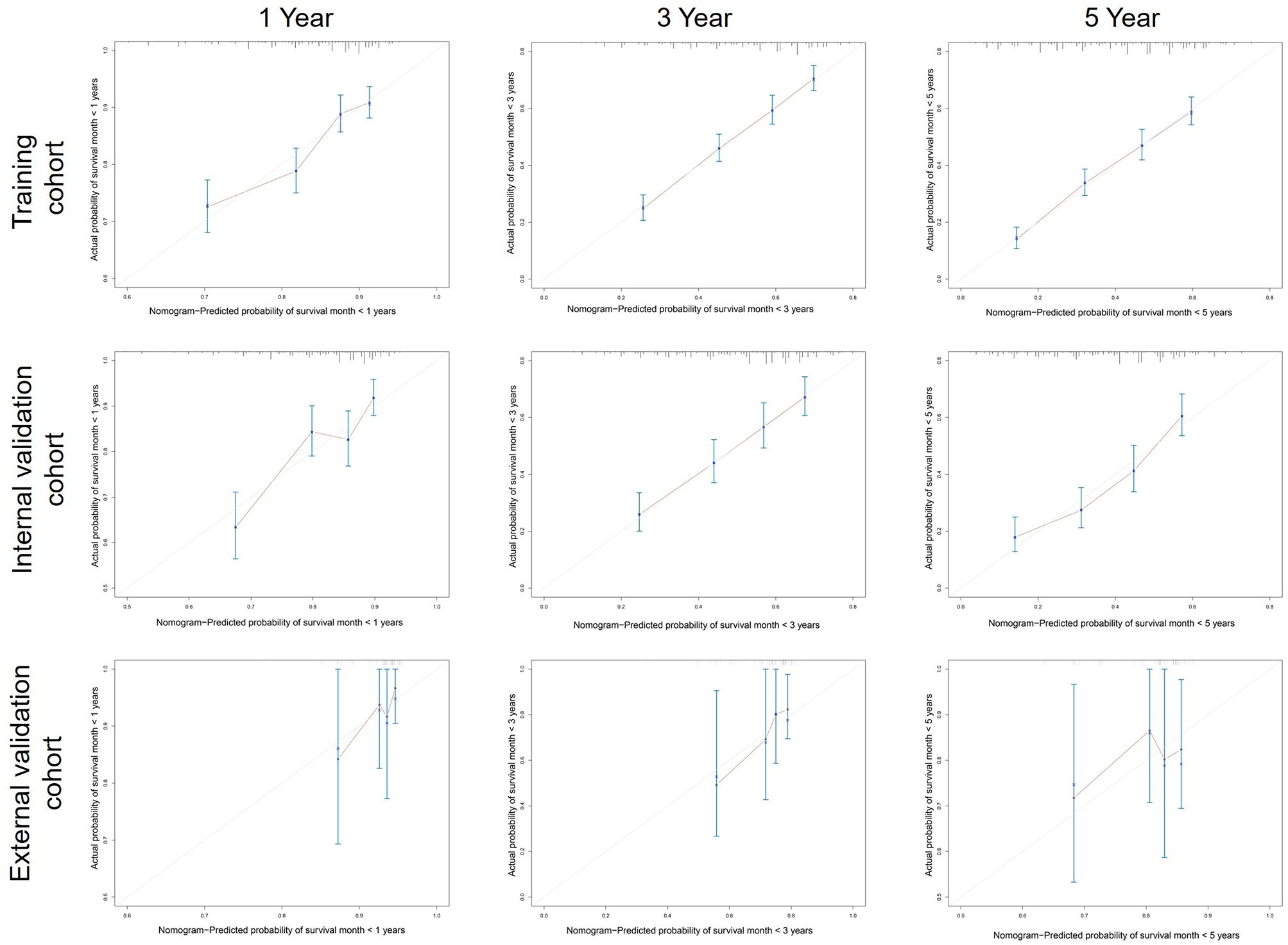Figure 3. Calibration curves predicting patients’ 1-, 3-, and 5-year OS in the training, internal, and external cohorts.
