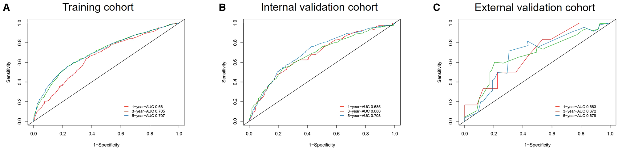 Figure 4. ROC curves and AUCs at 1, 3, and 5 years in the training cohort (A), internal validation cohort (B), and the external validation cohort (C).