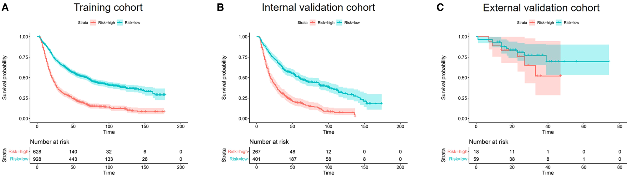 Figure 5. Kaplan–meier curves of OS for risk stratification in the training cohort (A), internal validation cohort (B), and the external validation cohort (C).