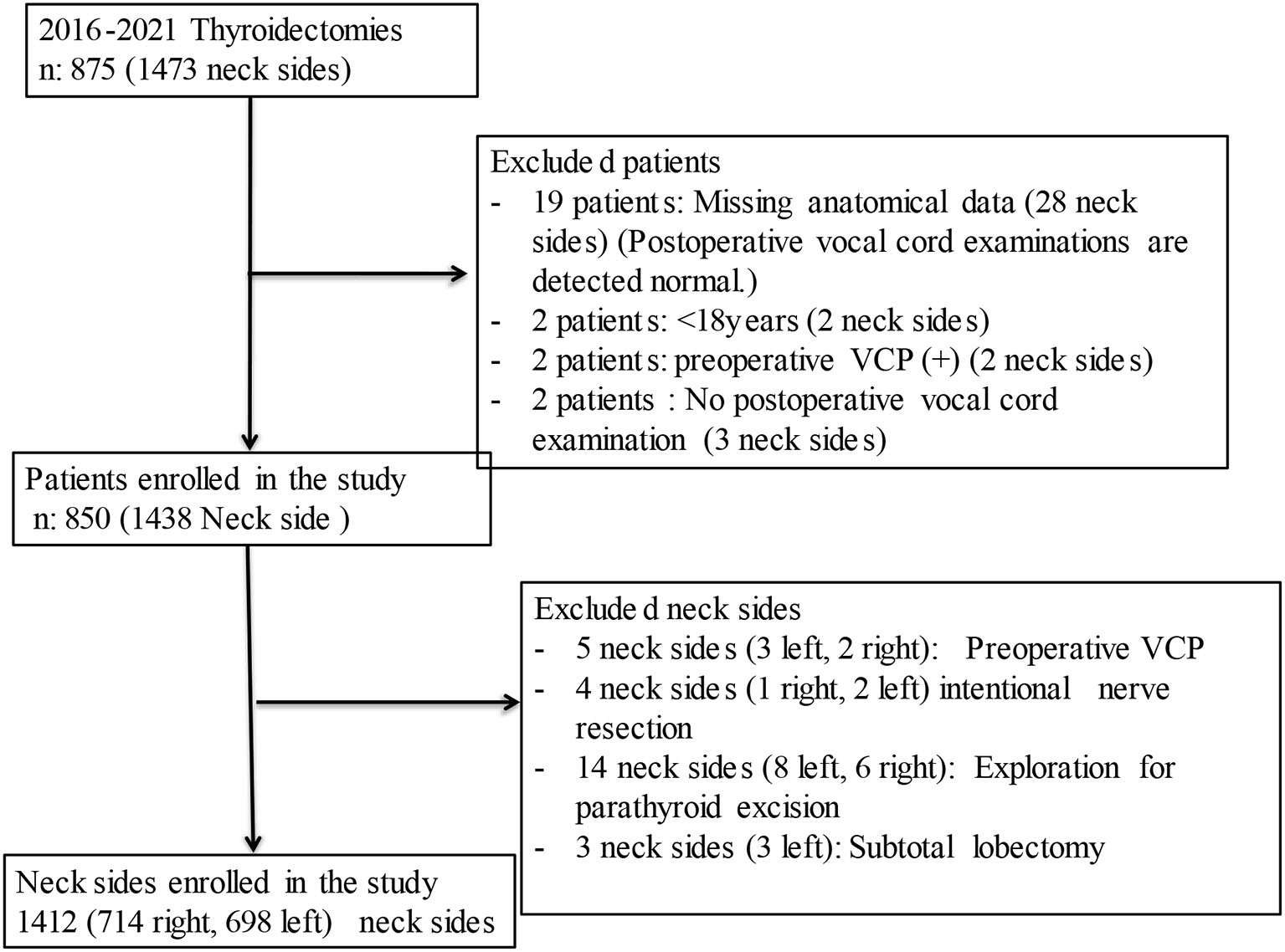 In the analysis of the data, each nerve at risk on each operated neck side was considered as a separate entity. Patients with preoperative vocal cord paralysis (VCP), intentional resection of the RLN due to tumor invasion, neck side where only parathyroidectomy or subtotal thyroidectomy was performed, neck sides without fully explored RLNs, neck side with missing data of RLN's anatomical features, and patients without postoperative vocal cord examinations, patients younger than 18 years of age were excluded from the study (Figure 1).
