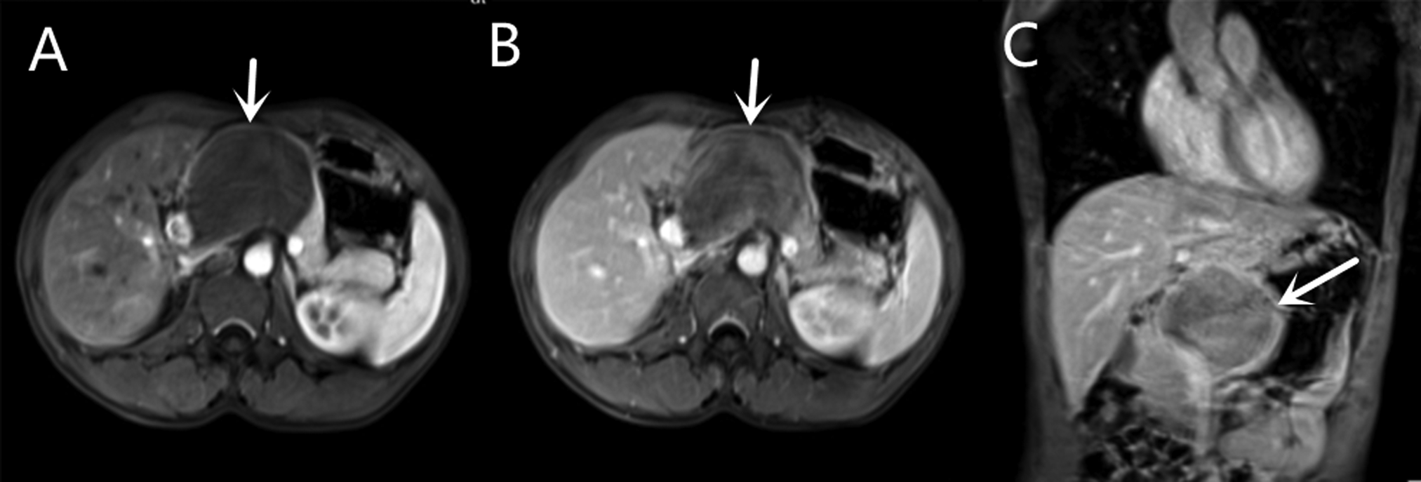Contrast-enhanced magnetic resonance (MR) of a mass on the pancreatic neck-body. (A) T1W Cross-sections MR in arterial phase. (B) T1W Cross-sections MR in portal phase. (C) T2W Axial MR in arterial phase.