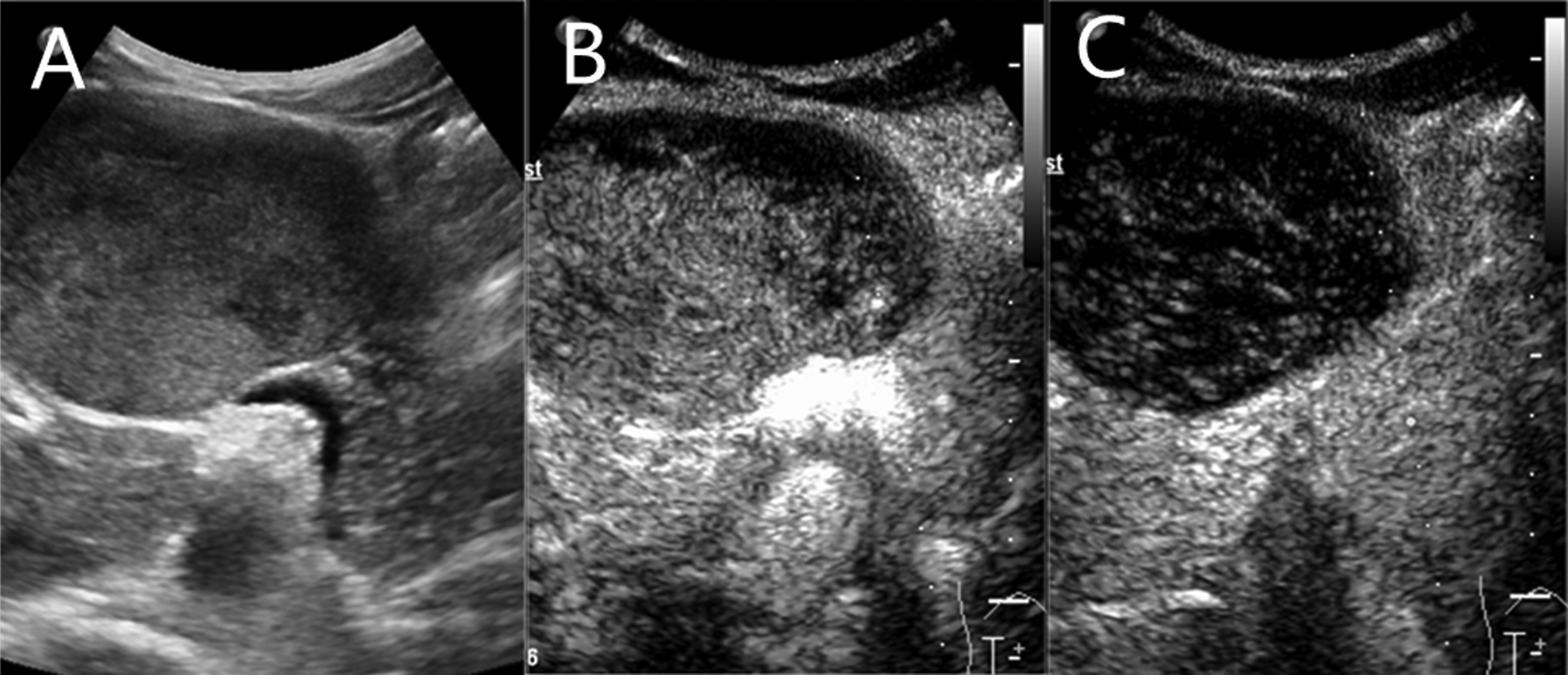 A slightly weaker echogenic mass on ultrasound. (A) Two-dimensional ultrasonography. (B) contrast-enhanced ultrasound (CEUS) in arterial phase. (C) CEUS in parenchymal phase.