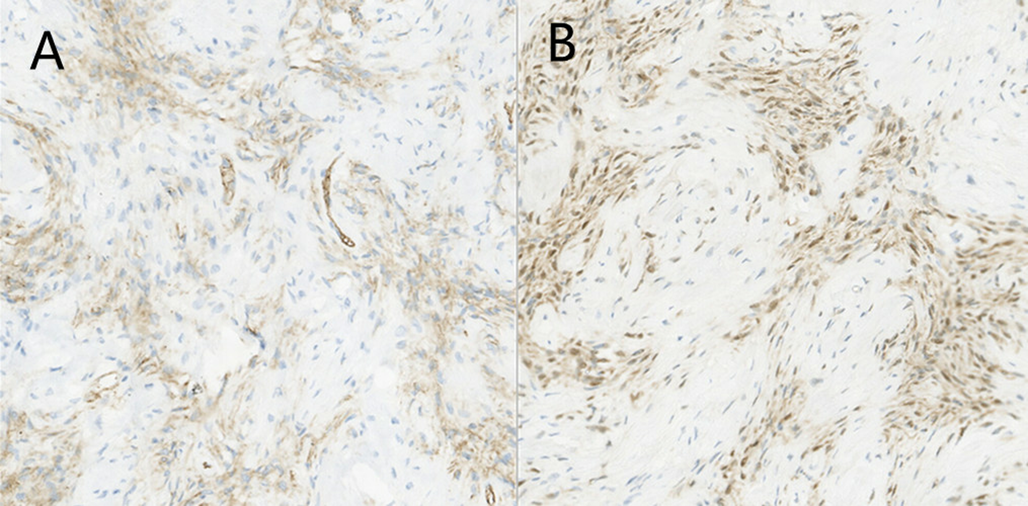 Photomicrograph of pancreatic neurofibroma. (A) Immunohistochemical staining [CD34(+)]. (B) Immunohistochemical staining [S100(+)].