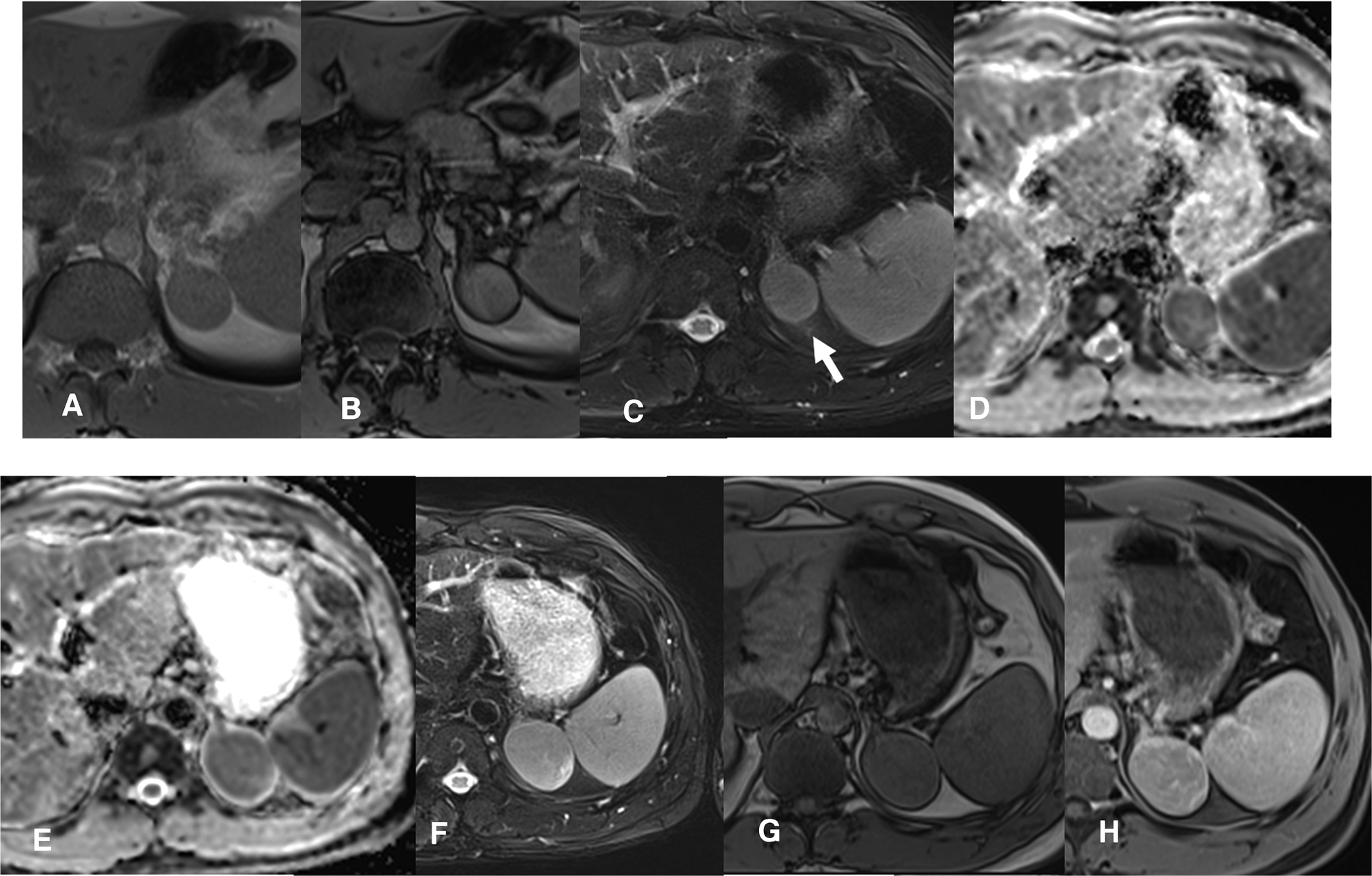 MRI scan 2019- Follow-up confirms the presence of a slightly enlarged, compared to the CT control, left adrenal solid mass. The T1 in-phase (IP) and out-of-phase (OOP) sequences (A,B) confirm a substantial absence of lipid content. The mass is rather homogeneous, isointense in T2 STIR (C, arrow), solid with restriction in the diffusion map (D). MRI scan 2020- A clear enlargement of the adrenal mass is present (maximum diameter about 5 cm), which is heterogeneously solid in the DWI map (E). Also in T2 w (F) the mass is larger and heterogeneous, in T1 w the mass has a parenchymal signal (G) with a slightly inhomogeneous post-contrast impregnation (H, venous phase).