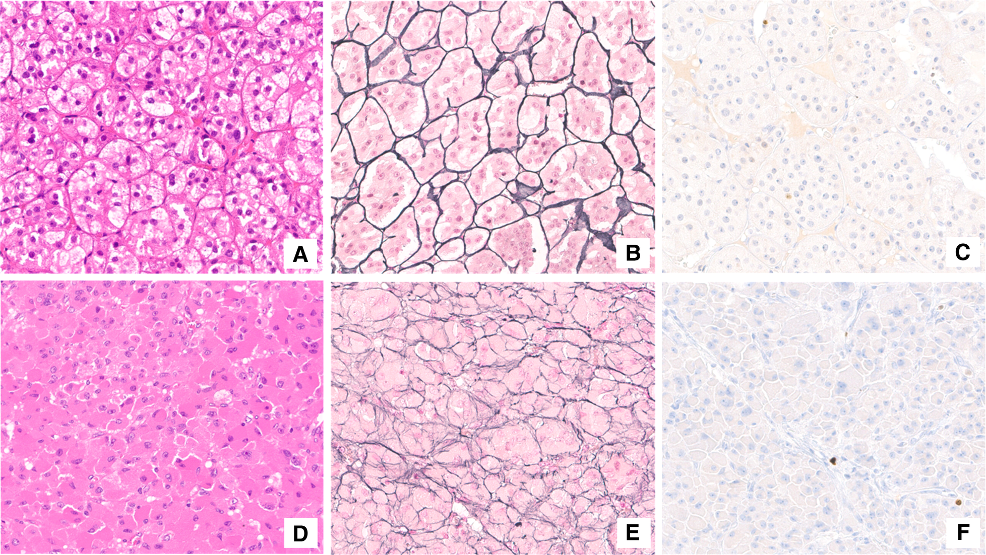 Histological assessment. Adrenocortical adenoma (A–C). The neoplasm was mainly composed of lipid-laden cells resembling those of normal zona fasciculata (A). The reticulin framework completely surrounded adrenal adenoma cells in small nests (B). Proliferation index (Ki-67) was lower than 1% (C). Adrenocortical oncocytoma (D–F). Oncocytic cells were characterized by granular eosinophilic cytoplasm and bland-appearing nuclei (D). The solid-alveolar pattern was better appreciated with reticulin stain (E). Ki-67 immunostaining labeled a very low number of neoplastic cells (F).