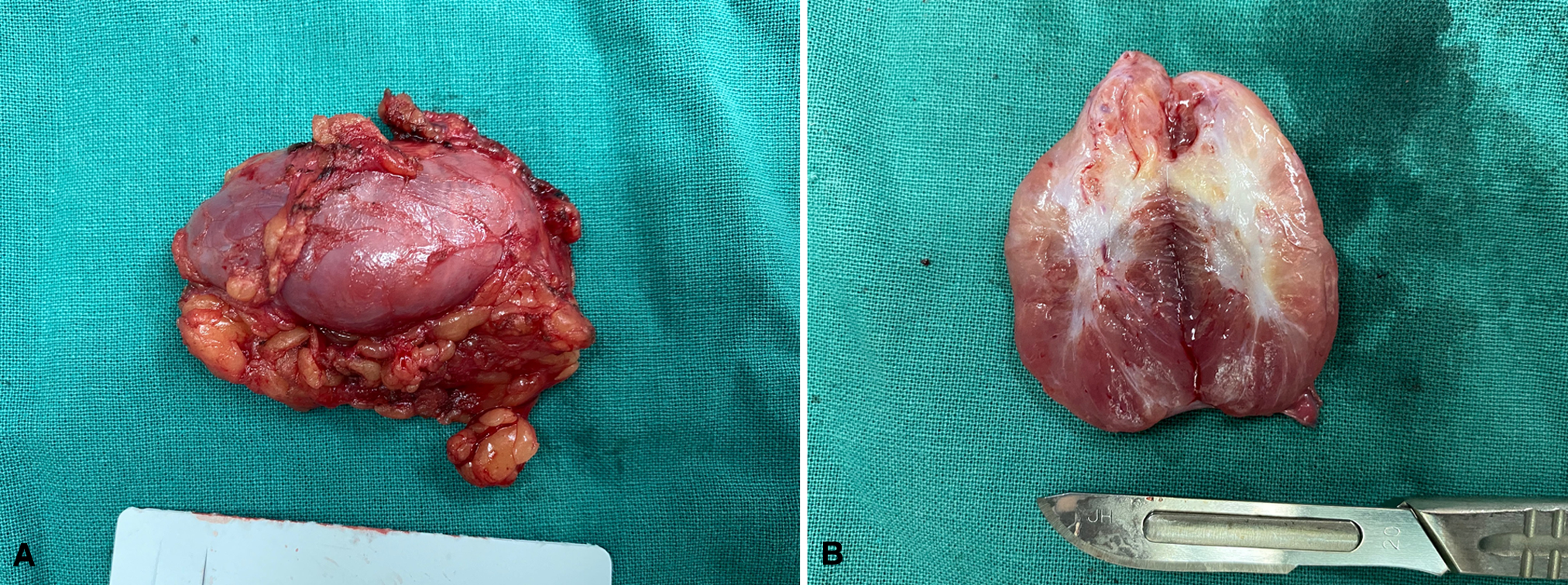 The macroscopic appearance and cut surface. (A) The surface of the tumor, (B)The cut surface of the tumor.