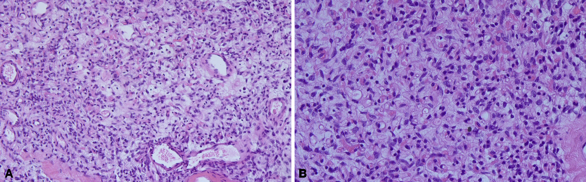 The histopathological examination. Spindle-shaped cells resting in the background of fibrous stroma containing delicate collagen fibers and numerous small to medium-sized thick-walled blood vessels. (A) ×100, (B) ×200.