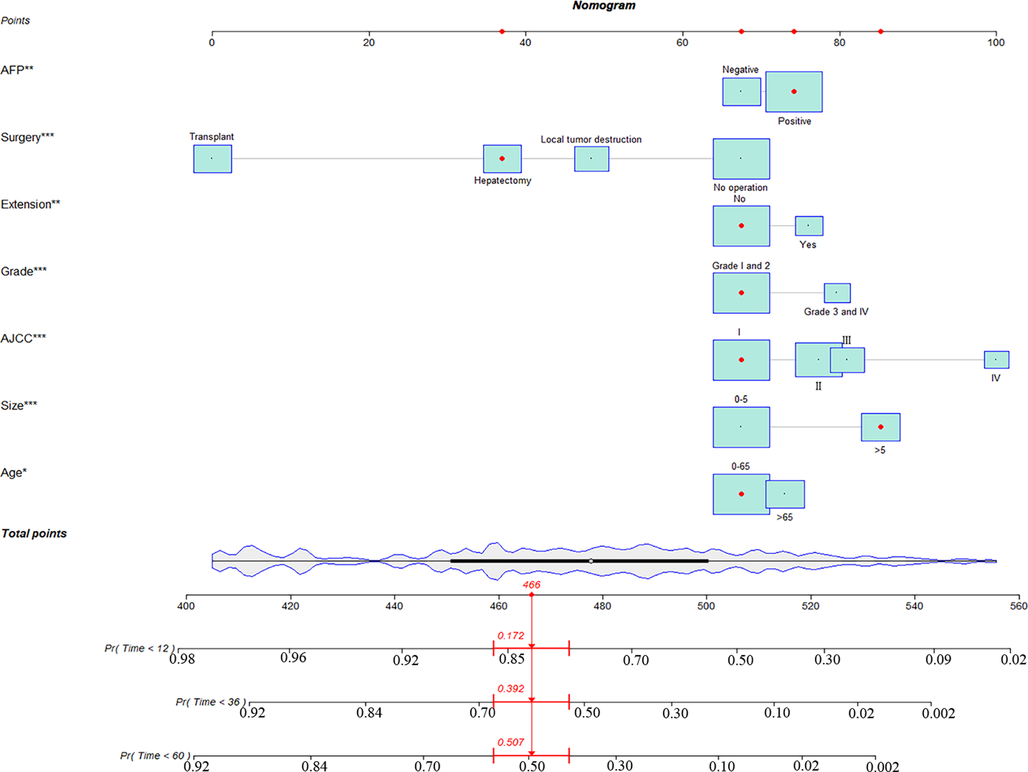 Univariate COX regression analysis showed that age, race, pathological grade, AJCC stages, tumor size, AFP, surgery, tumor size, and income were all statistically significant on prognosis (P < 0.05) (Table 2). Multivariate analysis suggested that age, pathological grade, AJCC stages, AFP, surgery, and tumor size were independent prognostic factors affecting the CSS of HCC patients with severe liver fibrosis, which were, therefore, included in the nomogram model.