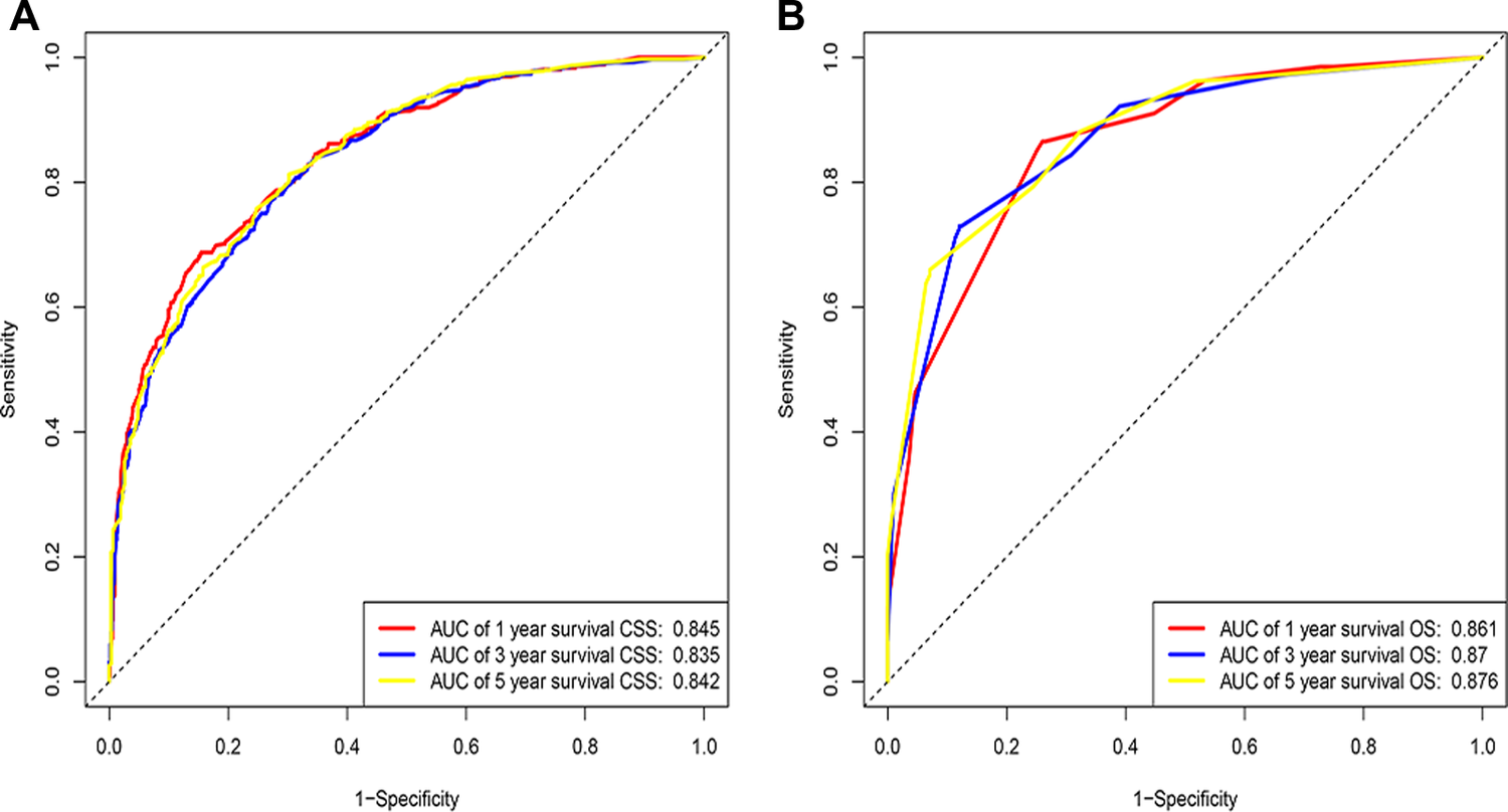 Seven variables were selected to establish the nomogram. The C-index (training cohort: 0.781, 95%CI: 0.767–0.793; validation cohort: 0.793, 95%CI = 95%CI: 0.779–0.798) and the time-dependent AUCs (the training cohort: the values of 1-, 3-, and 5 years were 0.845, 0.835, and 0.842, respectively; the validation cohort: the values of 1-, 3-, and 5 years were 0.861, 0.870, and 0.876, respectively) showed satisfactory discrimination. The calibration plots also revealed that the nomogram was consistent with the actual observations. NRI (training cohort: 1-, 2-, and 3-year CSS: 0.42, 0.61, and 0.67; validation cohort: 1-, 2-, and 3-year CSS: 0.26, 0.52, and 0.72) and IDI (training cohort: 1-, 3-, and 5-year CSS:0.16, 0.20, and 0.22; validation cohort: 1-, 3-, and 5-year CSS: 0.17, 0.26, and 0.30) indicated that the established nomogram significantly outperformed the AJCC staging system (P < 0.001). Moreover, DCA also showed that the nomogram was more practical and had better recognition.