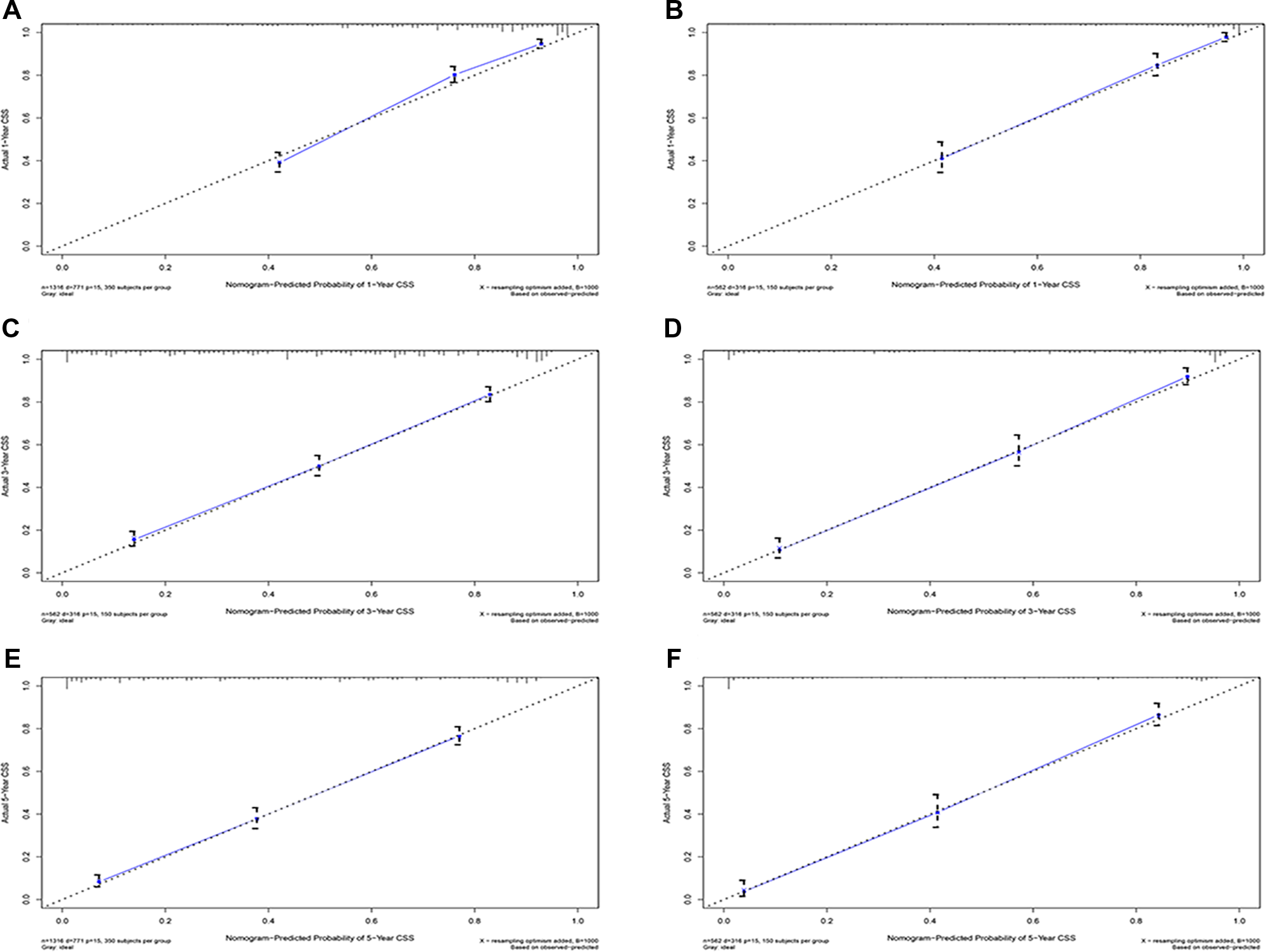 C-index and ROC curves reflected the predictive capability of the nomogram. The value was above 0.5, indicating predictive performance, which could be divided into low precision (0.5–0.7), medium precision (0.71–0.9), and high precision (>0.9). 1-, 3-, and 5- year calibration curves were plotted to evaluate calibrating ability, and the 45-degree line was used as the actual outcome of the primary model.