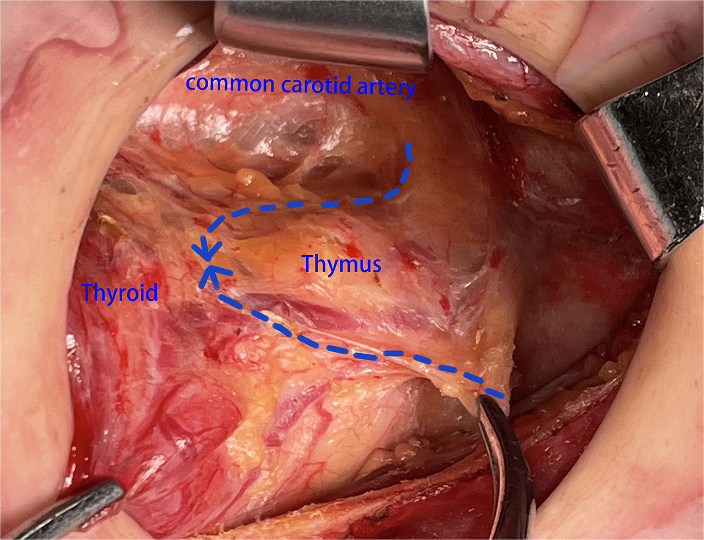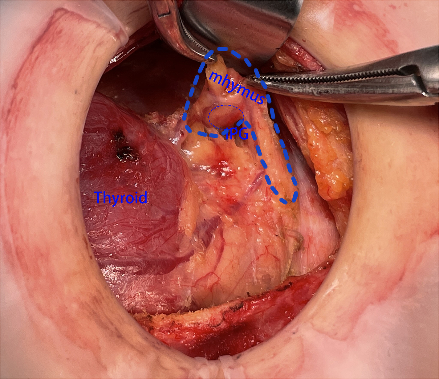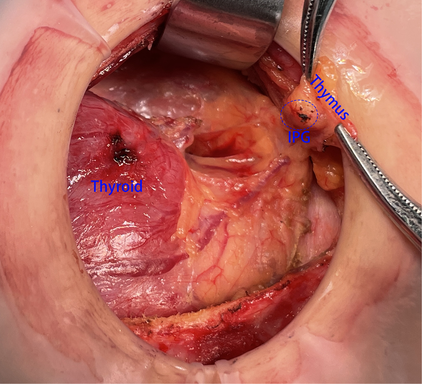 Figure 4). If IPG was not observed, we should continue separating the thyroid thymus ligament along the direction of the thyroid. Generally, IPG would be found within 10 mm distance from the top of the thymus. At this time, IPG and thymus could be