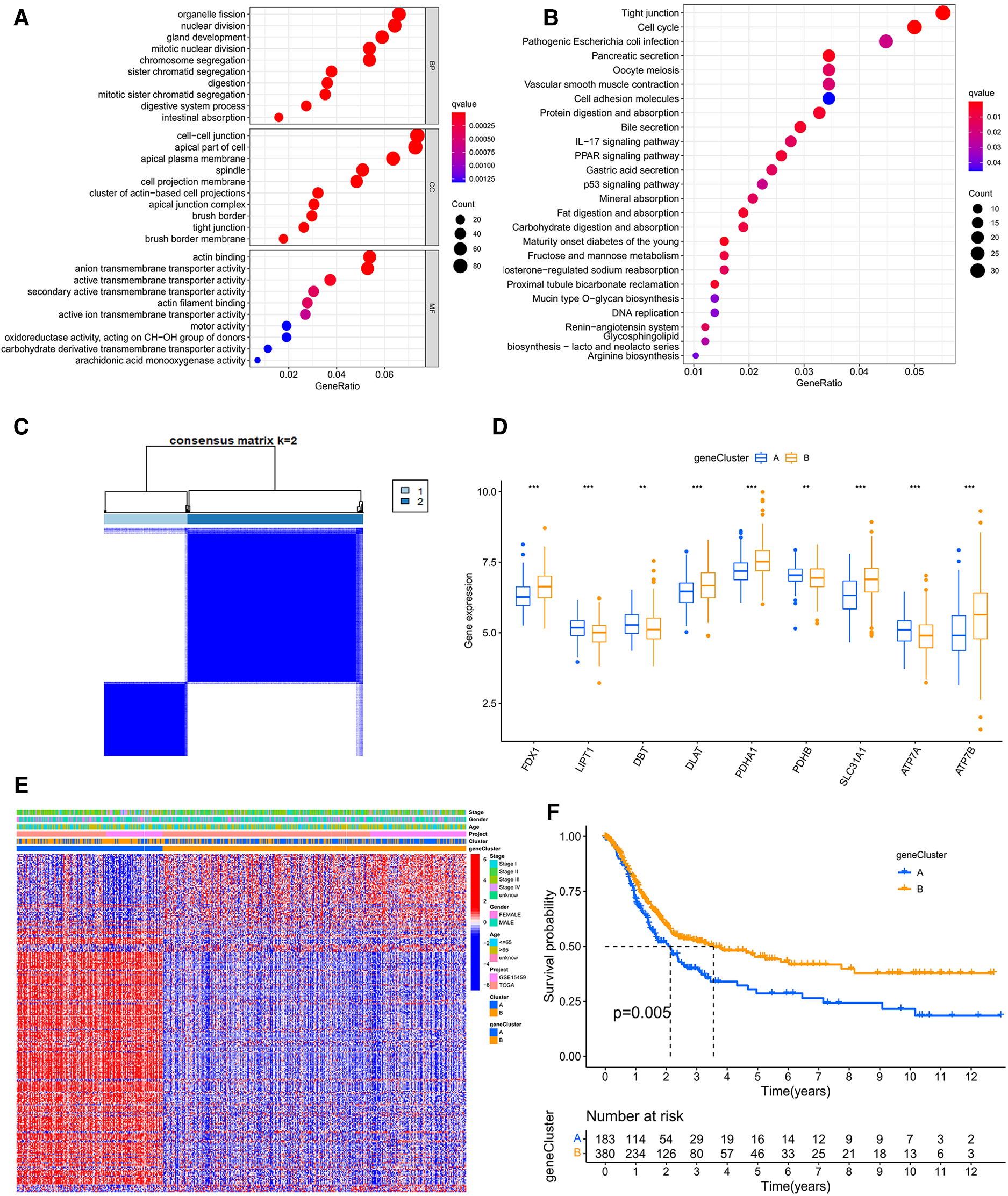 (A) The GO analysis based on the differentially expressed genes (DEGs). (B) The KEGG analysis of DEGs. (C) Consensus clustering matrix defining two clusters (k = 2) accroding to DEGs. (D) The expression of CRGs between A and B geneclusters. (E) The heatmap showing the correlation of the subtypes and geneclusters with clinicopathological data and CRGs. (F) The survival curve between A and B geneclusters. GO, Gene Ontology; KEGG, Kyoto Encyclopedia of Genes and Genomes.