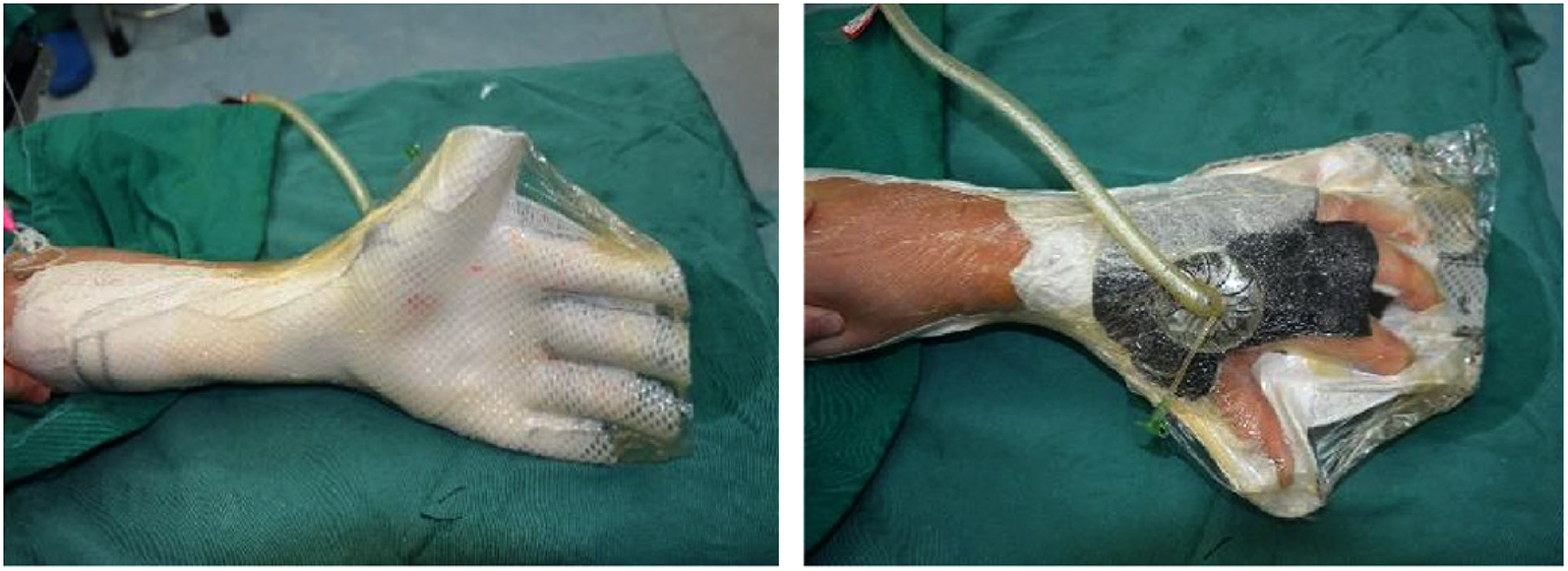 The hands are one of the most important parts of the human body. Although the hands only account for 3%–5% of the surface area of the body, they are especially vulnerable to injury (1). Deep partial-thickness hand burns that require surgery account for approximately 40% of hand burns. Negative pressure wound therapy (NPWT) is a safe and effective method for the treatment of hand burns, which promotes wound repair by accelerating angiogenesis and cell proliferation, contracting wound, reducing edema, and removing exudation (2, 3).
