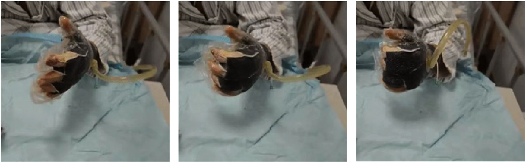 It is not easy to place negative pressure foam to treat deep partial-thickness hand burns. It is necessary to prevent air leakage and to avoid enclosing the whole hand with polyurethane film, which makes it impossible to carry out adequate exercise therapy (27, 28). Therefore, the negative pressure film should be refined as much as possible, and any healthy fingers should be exposed for easy movement when sealed with film. Our experience is that if there are no wounds on the fingers, they should not be covered, and it is essential to keep the thumb in abduction to ensure that the fingers can move freely during the postoperative negative pressure treatment. This allows patients to recover as soon as possible and avoid the function of the fingers being affected by a long immobilization time. Researchers have designed bag-type negative pressure wound therapy, in which the injured hand can be inserted easily to form a sealed bag over just the hand, and the fingers can start exercise training immediately during NPWT (29).