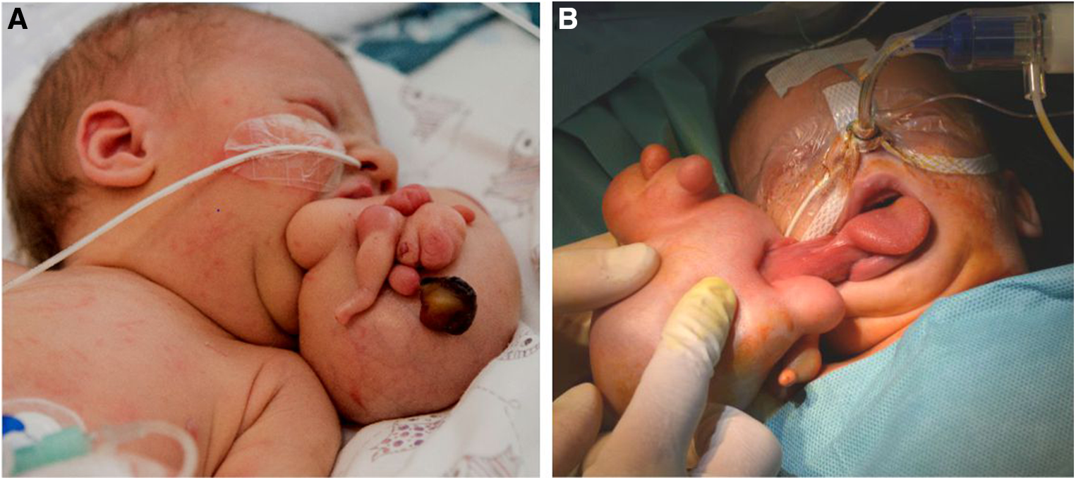 Terminology regarding heteropagus (parasitic twins) and its various subtypes is complex with terms often overlapping or being inconsistently used. Heteropagus, with an incidence of less than 0.1 per 100,000, is defined as conjoined twins, in which a severely defective and dependent twin (parasite) is connected to its mostly intact twin (autosite) (1). So far, the wide spectrum of clinical subtypes of heteropagus can be subdivided into endo- or exoparasitic twins. Exoparasitics twins include for instance the epigastric heteropagus, omphalo- and thoracopagus as well as the twin reverse arterial perfusion (TRAP) sequence. On the other hand, endoparasitic twins or so called fetuses-in-fetu are malformed parasitic twins that are usually found within the body of the living partner (2). They are mostly located in the retroperitoneal space (3) but can also present as a mass attached to palatal or pharyngeal structures, which is known as epignathus (4, 5).