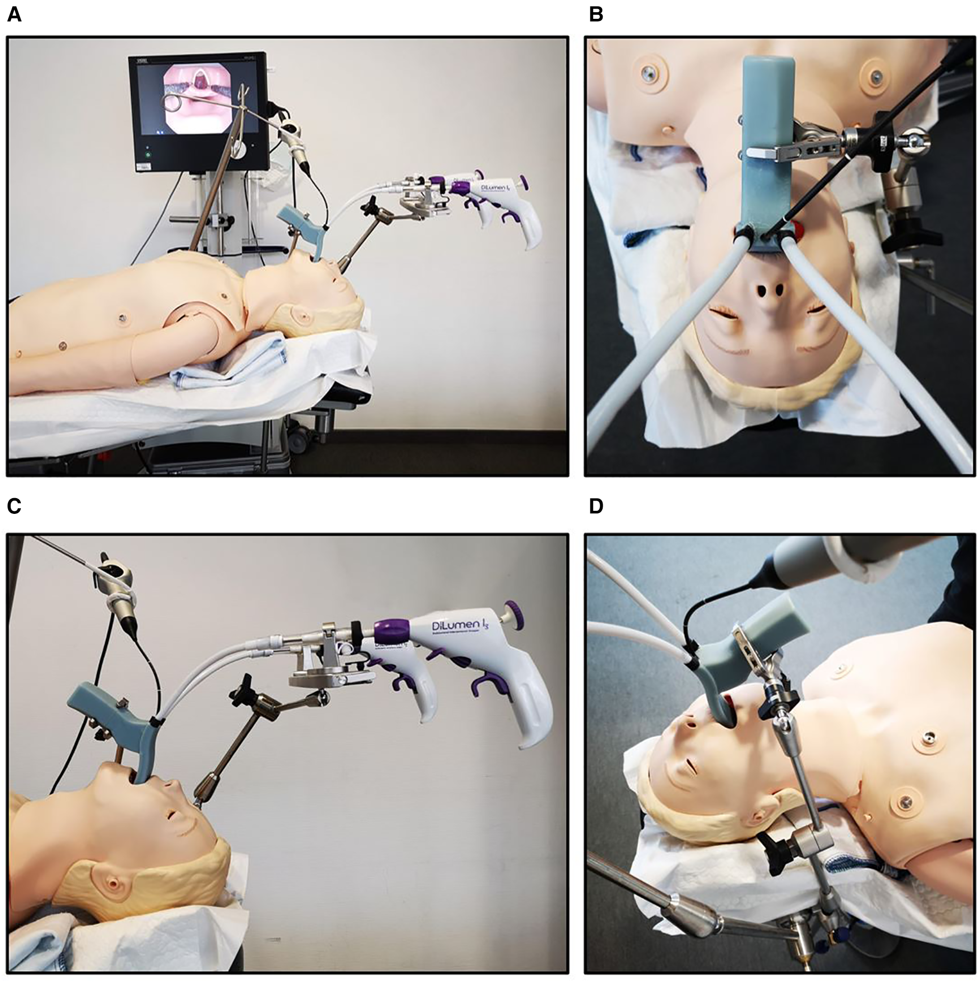 (A–D) Experimental setup of the user study. After the patient simulator was placed on the operating table, the 3D-printed sMAC laryngoscope was attached to the operating table using a clamping jaw and an articulated stand. The image of the flexible video endoscope was displayed on an 18.5-inch Monitor.