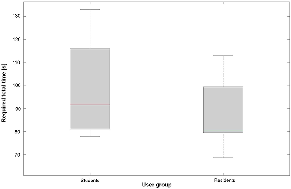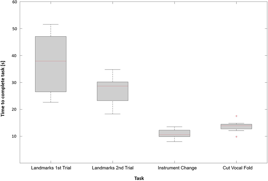 All participants were able to complete the given tasks successfully. The time the participants needed to perform each given task is illustrated in Figure 5. Reaching for the laryngeal landmarks took significantly less time in the second trial as compared to the first trial (27.5 s ± 5.2 s vs. 39.7 s ± 16.5 s, p = 0.008). Instrument changes were performed in a time of 10.9 s ± 1.7 s. To bimanually perform a cut in the vocal fold the participants needed 13.7 s ± 1.9 s. On average the group of residents took less time to complete the given tasks compared to the group of medical students (88.0 s ± 15.3 s vs. 98.6 s ± 24.6 s, p = 0.48), as shown in Figure 6. However, this result was not statistically significant.
