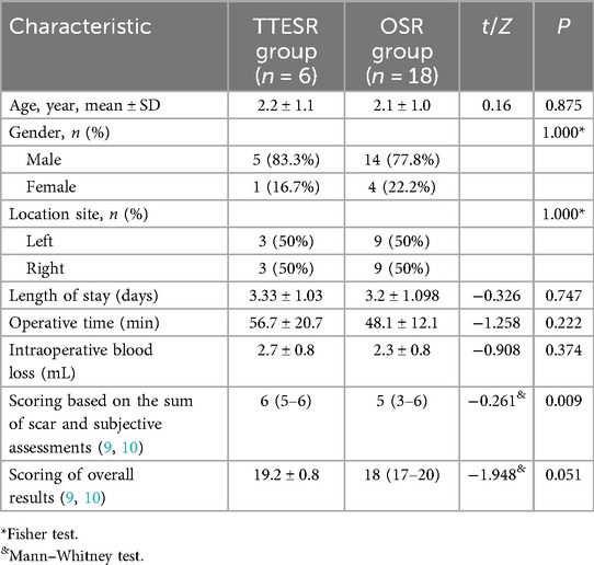 TTESR was performed on 6 patients by the same surgical team led by Dr. Sun. This study included 18 children with OSR, who were selected based on age and lesion site matching criteria and subsequently treated by other surgical teams. Abnormal head positioning was observed in all patients, leading to their evaluation as candidates for surgical intervention. A neck splint was employed in the postoperative period. The clinical data collected and analyzed included gender, age, lesion location, length of hospital stay, operative duration, intraoperative blood loss, scar scoring and subjective assessments, as well as overall result scoring. In our cohort, subjective assessments commonly focused on factors such as whether wound infection or visibility.