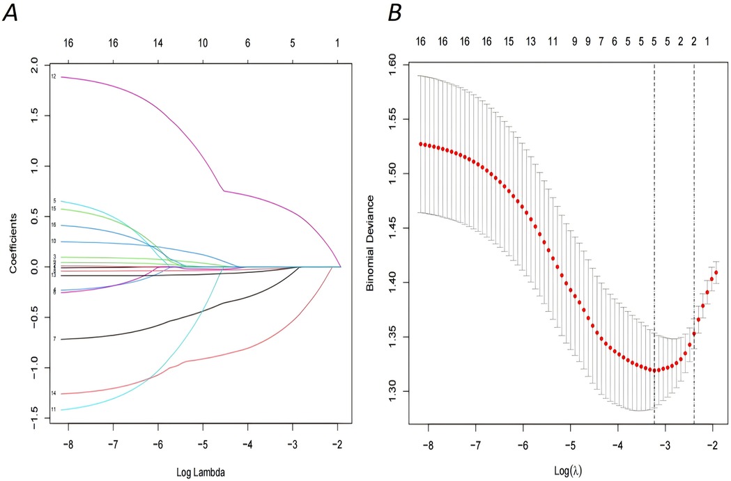 Figure 1. Demographic and clinical feature selection using the LASSO regression model. (A) LASSO coefficient profiles of the 16 features.A coefficient profile plot was produced against the log (lambda) sequence, optimal lambda resulted in five features with nonzero coefficients. (B) The selection of the optimal parameter within the LASSO model was executed through a five-fold cross-validation approach based on the minimum criterion. Vertical dotted lines were drawn at optimal values using the minimum criteria and its 1 SE (1—SE criteria).