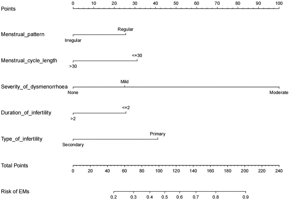 Nomograms are widely used as important predictive tools in oncology and medicine. Such diagrams can present information in a clearer, more intuitive manner, which is easier to understand and more convenient for clinical application. The predictive nomogram we developed regarding whether infertile women have EMs or not has demonstrated good discriminative ability and calibration performance in the internal validation of the cohort. In particular, the high C-index in the interval validation indicates that it is helpful for the personalized prediction of whether infertile women have EMs or not. Based on the prediction results, the next step of diagnosis and treatment plans can be formulated, such as whether to conduct laparoscopic exploration or adopt other treatment options like assisted reproduction.