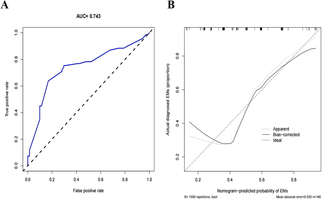 Figure 3. Evaluation and validation of the nomogram prediction model. (A) The ROC curve of the nomogram prediction model. (B) Calibration curves of the Infertility-Related EMs prediction in the cohort, The x-axis represents the predicted EMs risk, the y-axis represents the actual diagnosed EMs. The diagonal dotted line symbolizes the flawless predictions generated by an ideal model. The solid line depicts the performance of the nomogram, and the nearer it is to the diagonal dotted line, the more precise the prediction it implies.