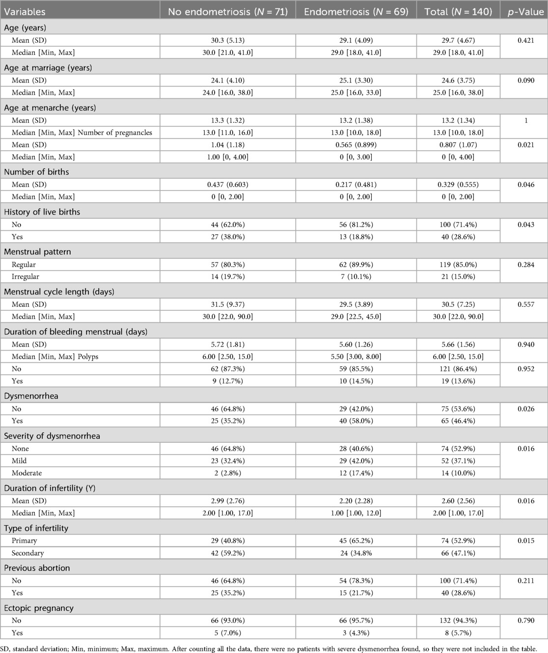 In this study, there was no statistically significant difference between the two groups in terms of menstrual pattern, menstrual cycle length, and duration of menstruation. However, Moini et al. (22) concluded that menstrual cycle length was negatively correlated with the risk of EMs, whereas irregularity of menstrual, duration, and amount of menstrual bleeding were only associated with severe EMs. Since this study did not conduct research and exploration on the severity grading of EMs, the correlation between infertile women with EMs and menstrual characteristics was not obtained. Also, considering that each woman has a different understanding of bleeding, it was not included in the study. Most studies have shown that shorter menstrual cycles with longer bleeding time and bleeding volume are associated with increased EMs (22, 23), and the findings of the above scholars are in line with our most commonly cited theory of menstrual blood reflux in the formation of EMs.
