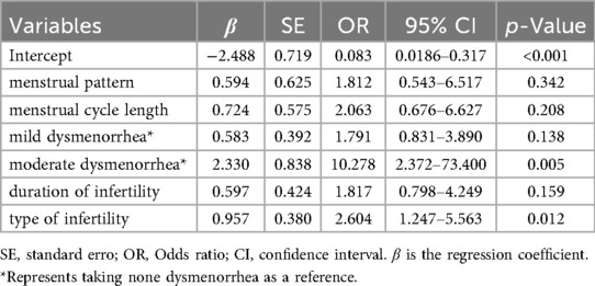 The five factors selected by the LASSO regression model include: menstrual regularity (coded as “irregular” = 0, “regular” = 1), menstrual cycle length (coded as “>30 days” = 0, “<=30 days” = 1), the severity of dysmenorrhea (coded as “none” = 0, “mild” = 1, “moderate” = 2), duration of infertility (coded as “>2 years” = 0, “<=2 years” = 1), and type of infertility (coded as “secondary” = 0, “primary” = 1). These factors were used as independent variables, with the presence of EMs in infertility patients as the dependent variable (coded as “No-EMs” = 0, “EMs” = 1) for a LR analysis. The results indicated that the severity of dysmenorrhea and type of infertility are independent risk factors for the presence of EMs in infertility patients (p < 0.05) (see Table 2).